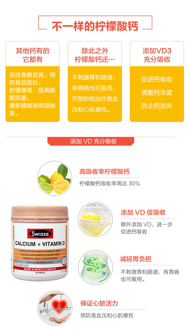 这款Swisse 维生素D柠檬酸钙片,澳洲进口, 可促进骨骼发育,预防骨质疏松,舒缓情绪,提高睡眠质量,缓解腰酸背痛和抽筋等症状;可预防和治疗高血压和心肌梗死。