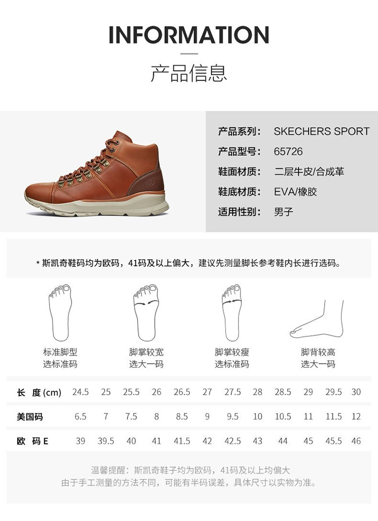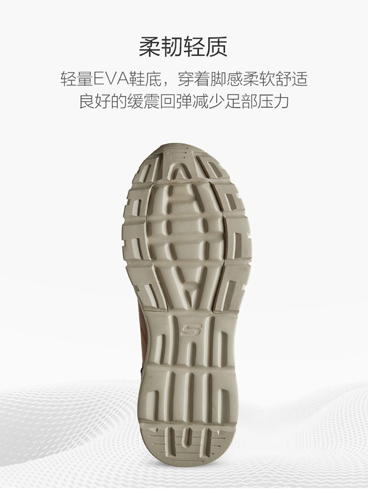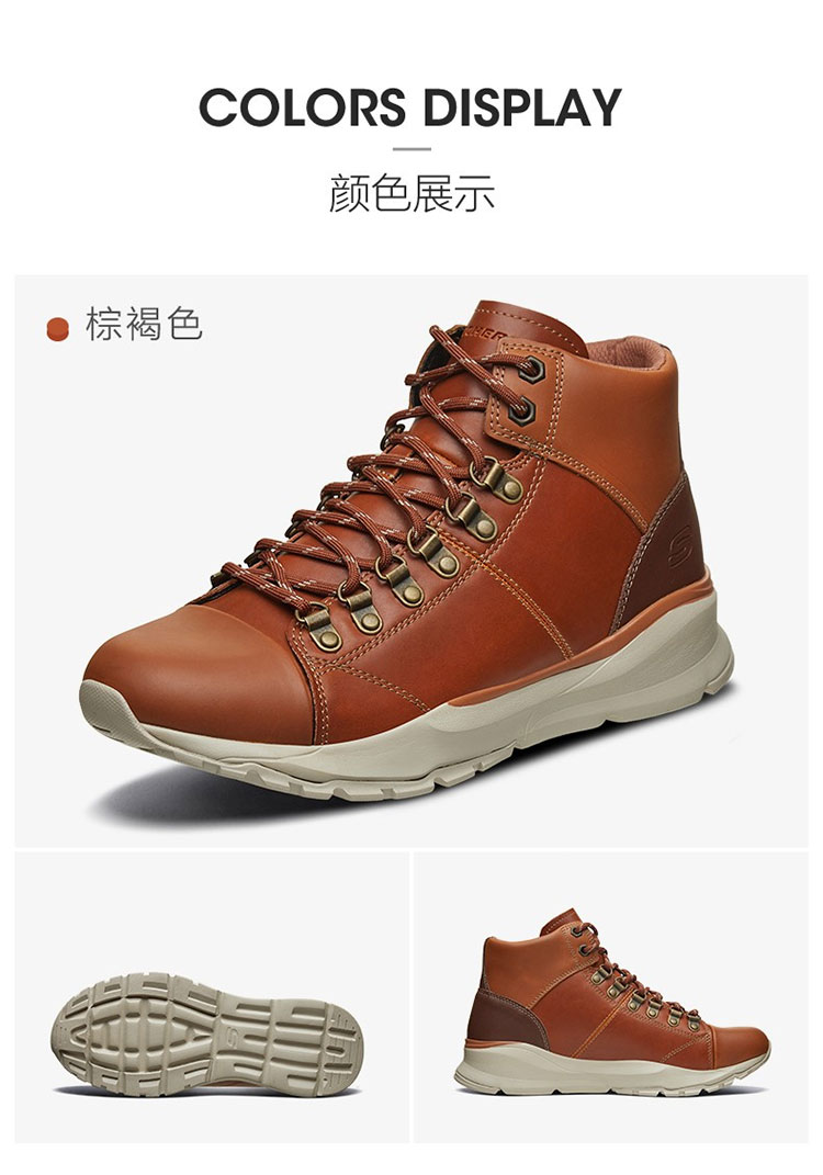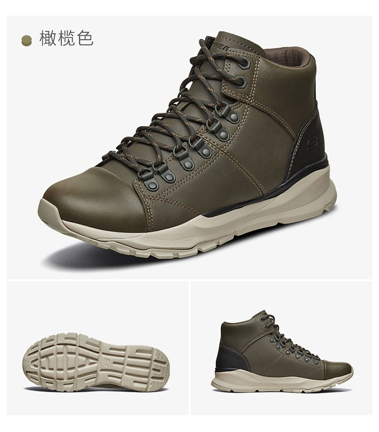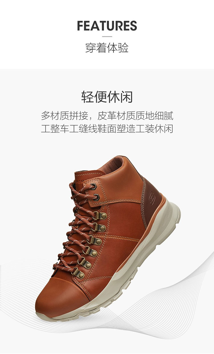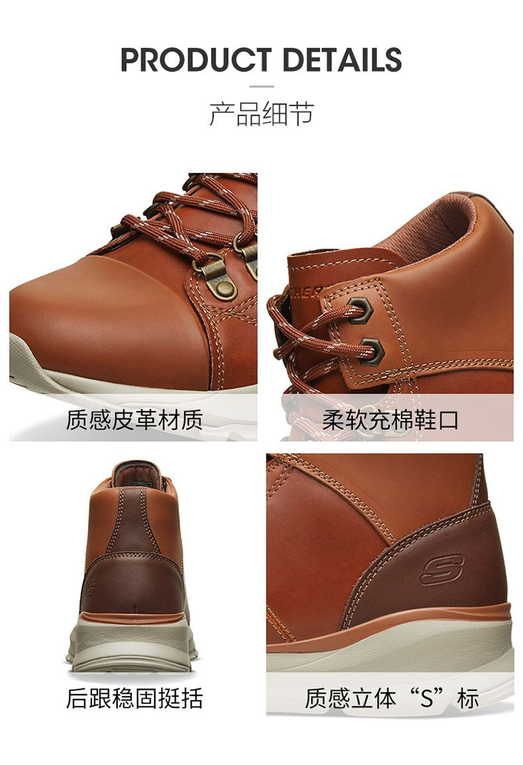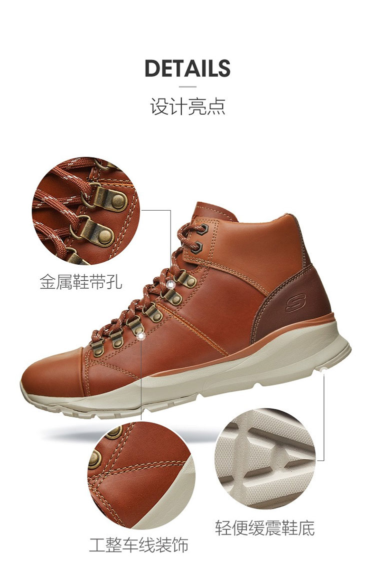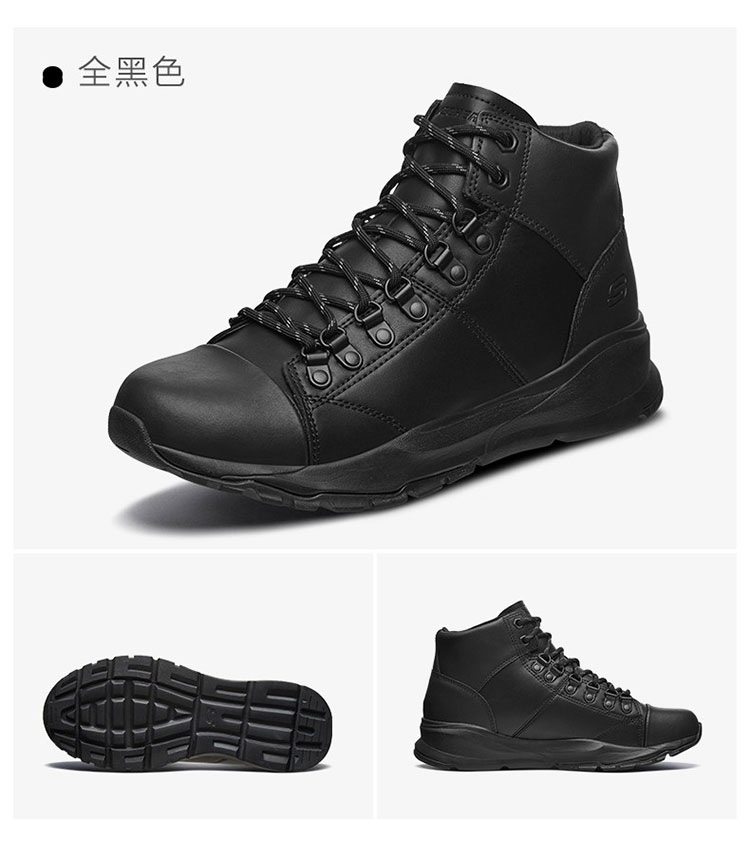 斯凯奇 男士 马丁靴,暖型风潮轻便设计,二层牛皮+合成革多材质拼接,皮质细腻充满质感、轻量EVA鞋底搭配三层结构记忆鞋垫,吸湿透气,穿着脚感柔软舒适,具有良好的缓震回弹效果、减少足部压力,久穿不累。