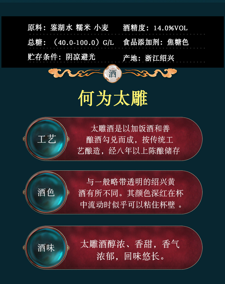 太雕酒是以加饭酒和善酿酒勾兑而成,按照传统工艺酿造,经八年以上陈年储存,与一般略带透明的绍兴黄酒有所不同,其颜色深红,在杯中流动时似乎可以粘住杯壁,醇厚香甜,香气浓郁,回味悠长。