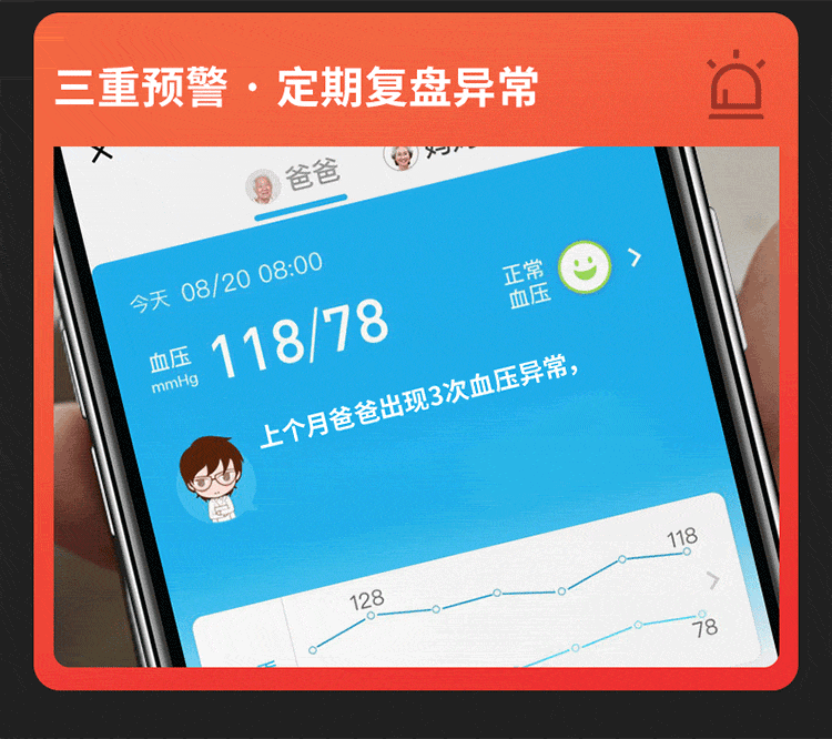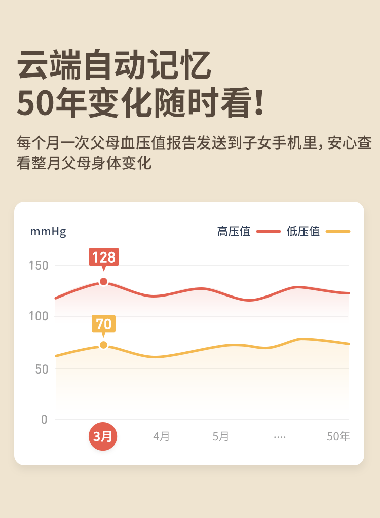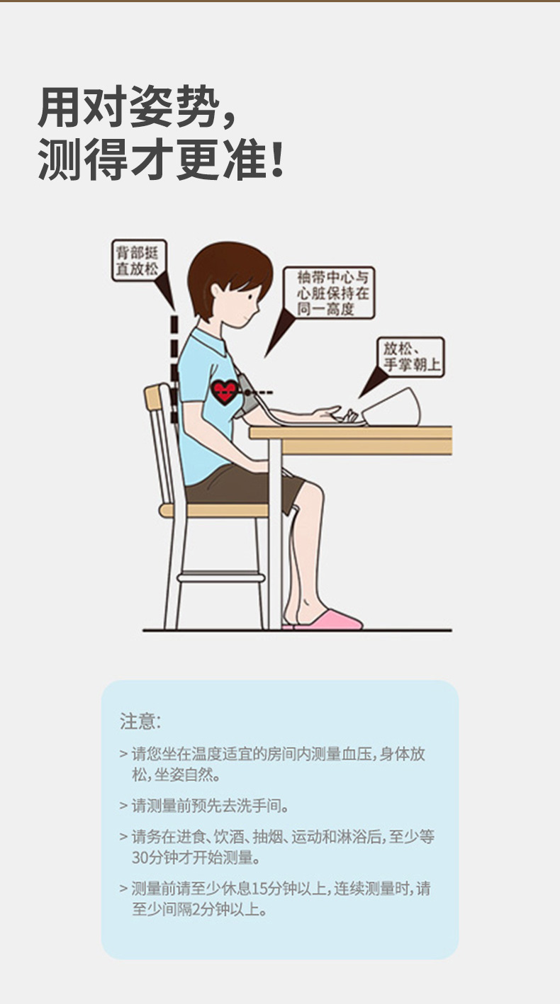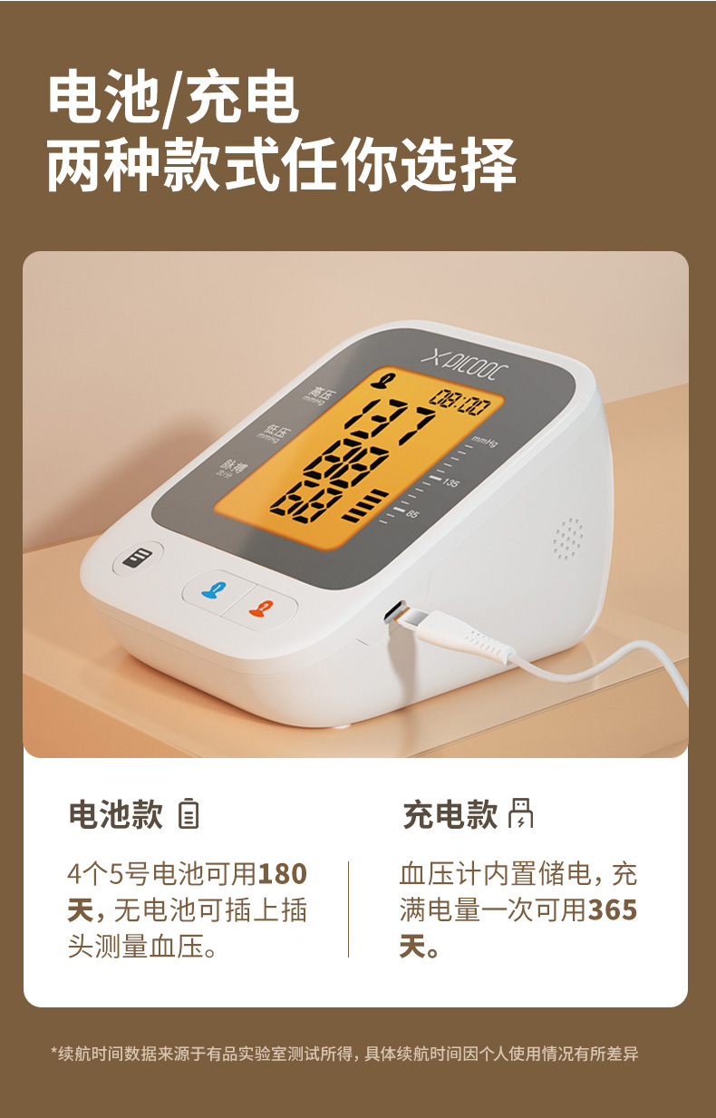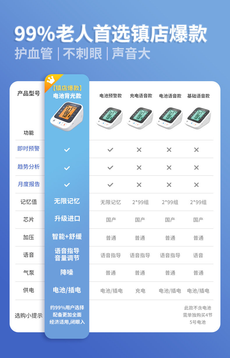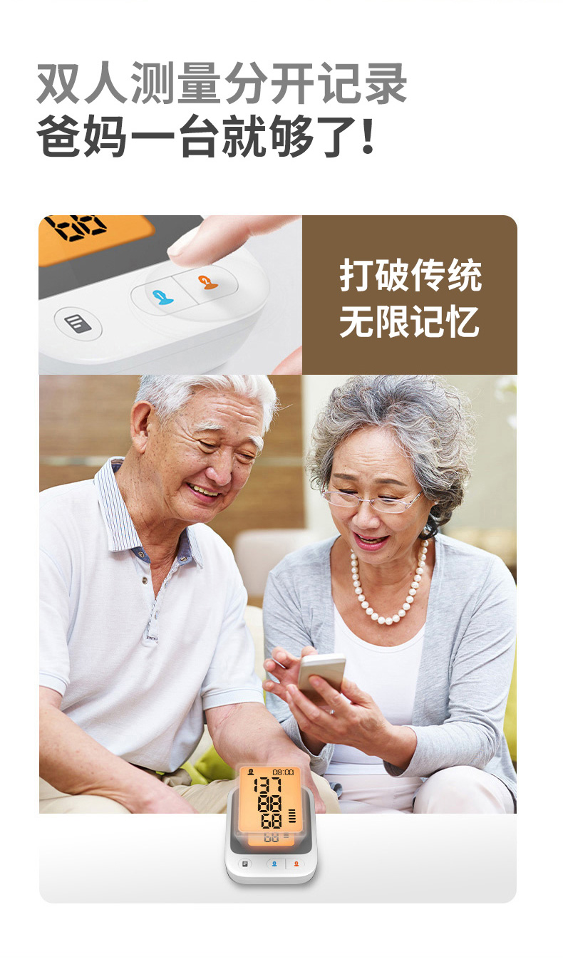 搭配高清大屏,字体更大,并拥有真人语音播报功能,即便老人视力不佳,仍能清晰了解血压状况。干电池供电,更换起来也方便,不用担心忘记充电。