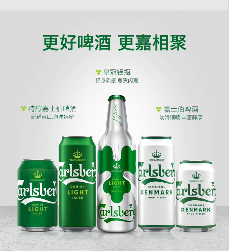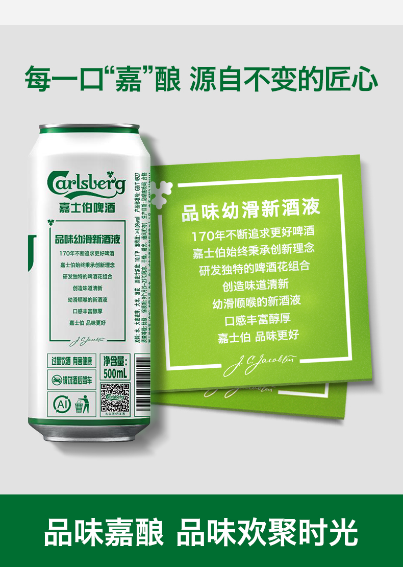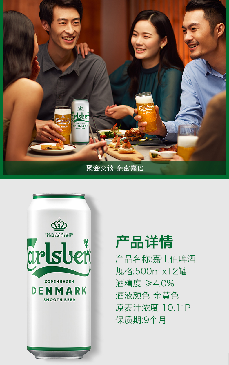 嘉士伯是丹麦著名的啤酒品牌,从1904年开始,被丹麦皇室指定为御用啤酒,其商标上多了一个皇冠的标志,这在国外是很高的荣誉了,特醇嘉士伯啤酒,精选优质小麦,口感香醇顺滑,让你一喝上瘾~丰富泡沫。