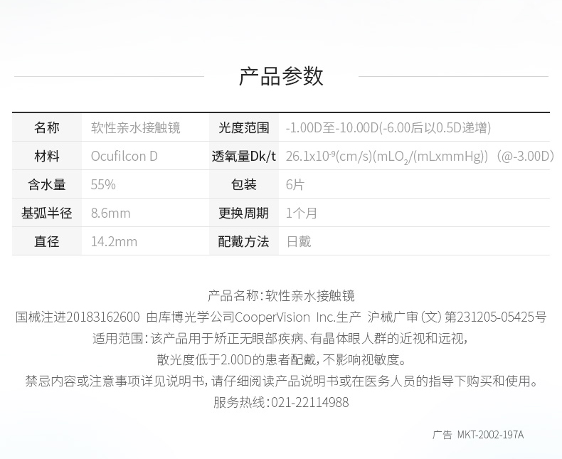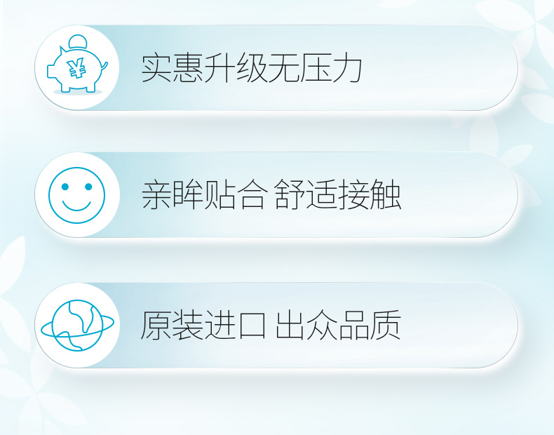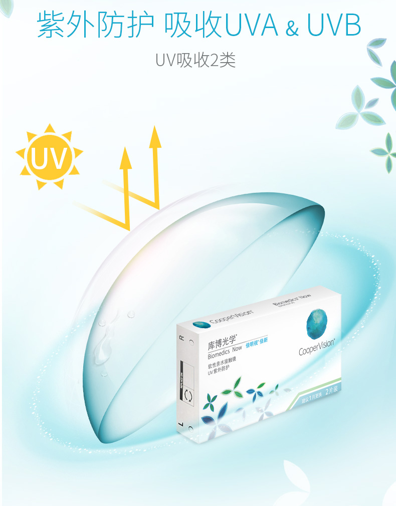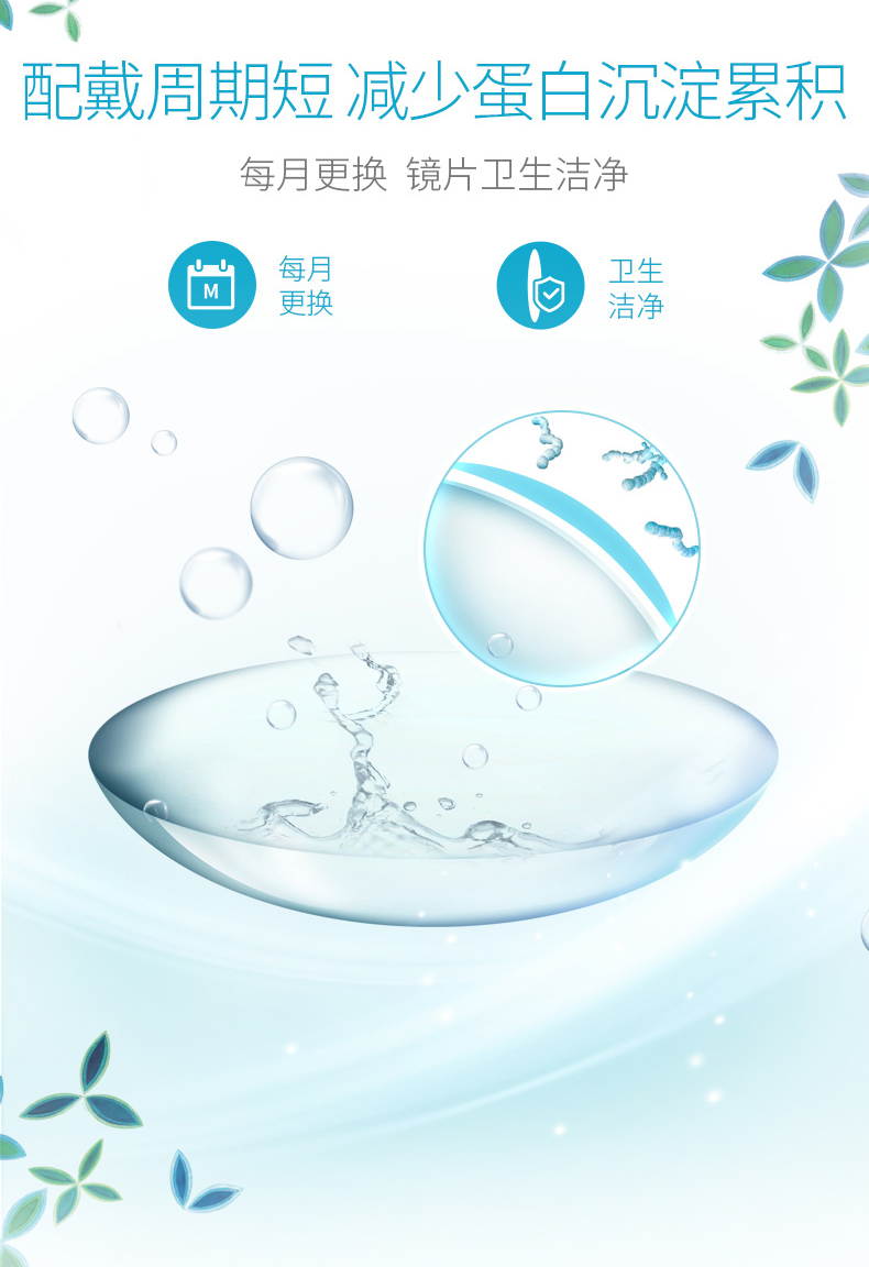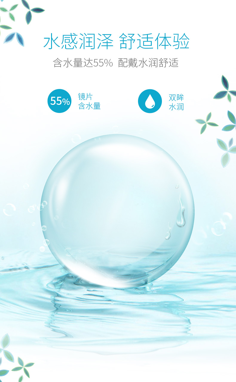 这款隐形眼镜中心厚度只有8.7mm,含水量高达52%,高效缩水,去干涩;添加紫外线吸收剂,能够有效阻挡70%的UVA以及96%的UVB,时刻保护眼睛,更周全。