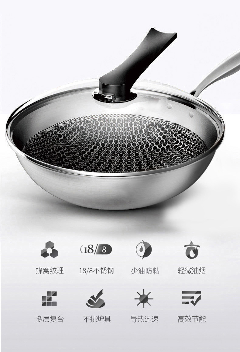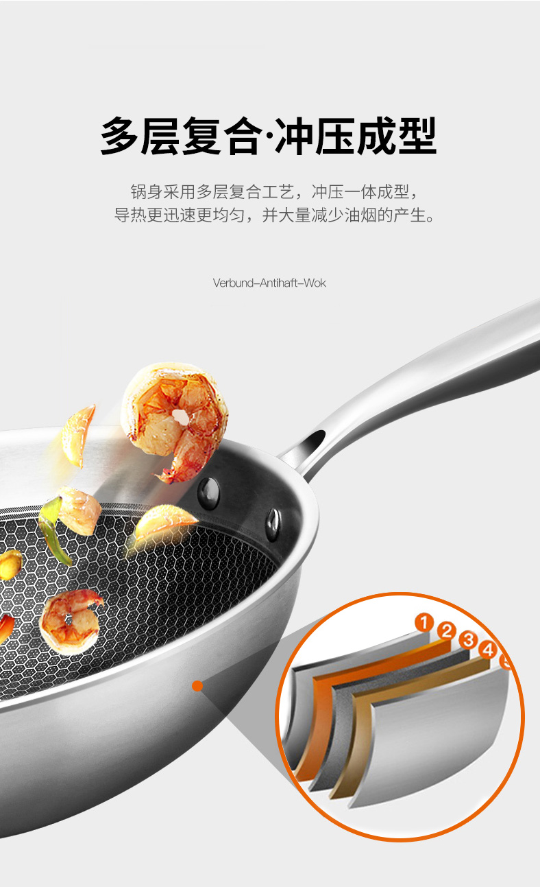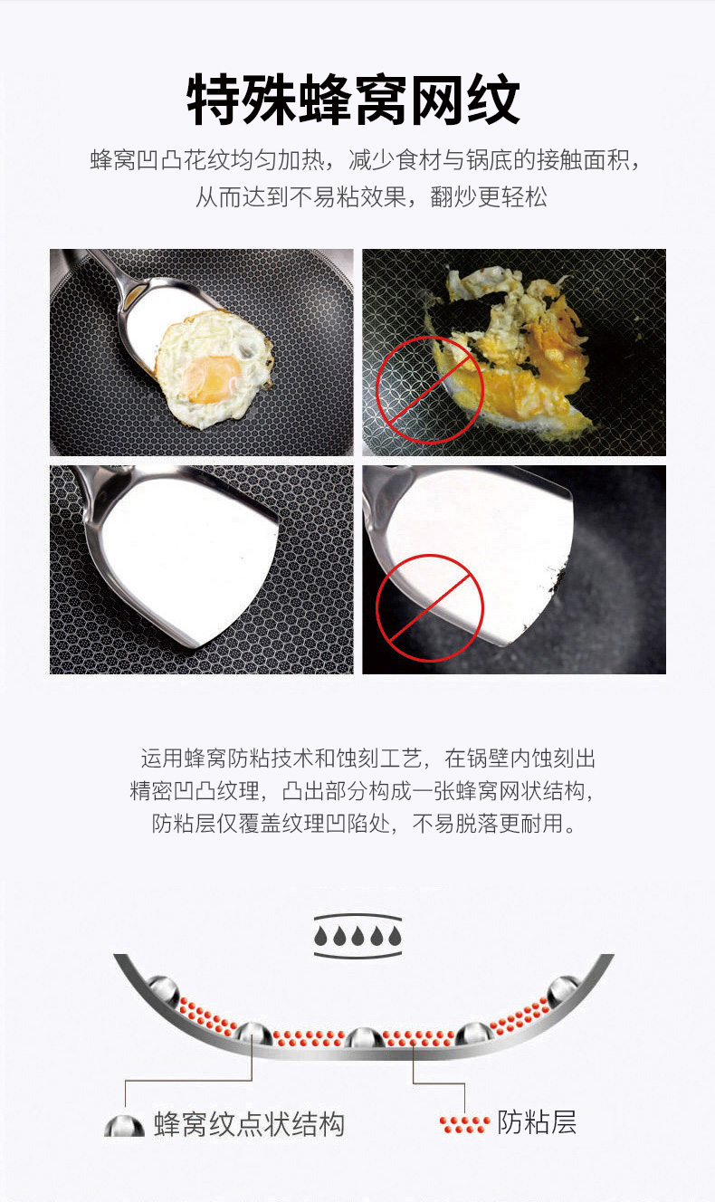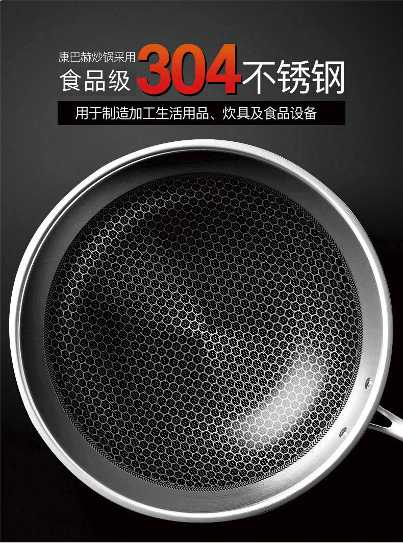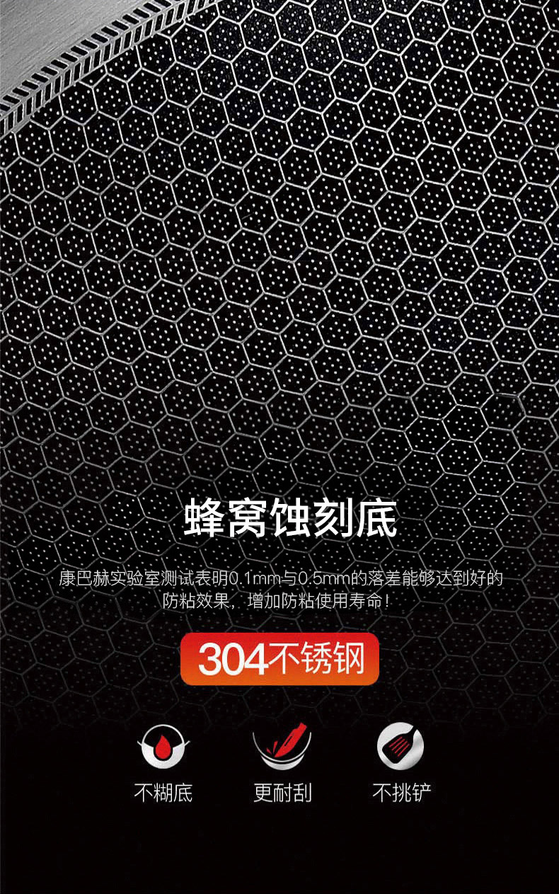 这款KBH 康巴赫 无油烟蜂巢304不锈钢不粘锅,采用德国蜂巢浮雕技术,减少食物与锅面的接触面积,形成气体悬浮,达到物理不粘的效果;锅身采用多层复合工艺,冲压一体成型,导热迅速均匀,加热锅底不易变形,并快速将热能传递到锅身,节能省油;健康、安全,直径32cm,足够3口之家使用。