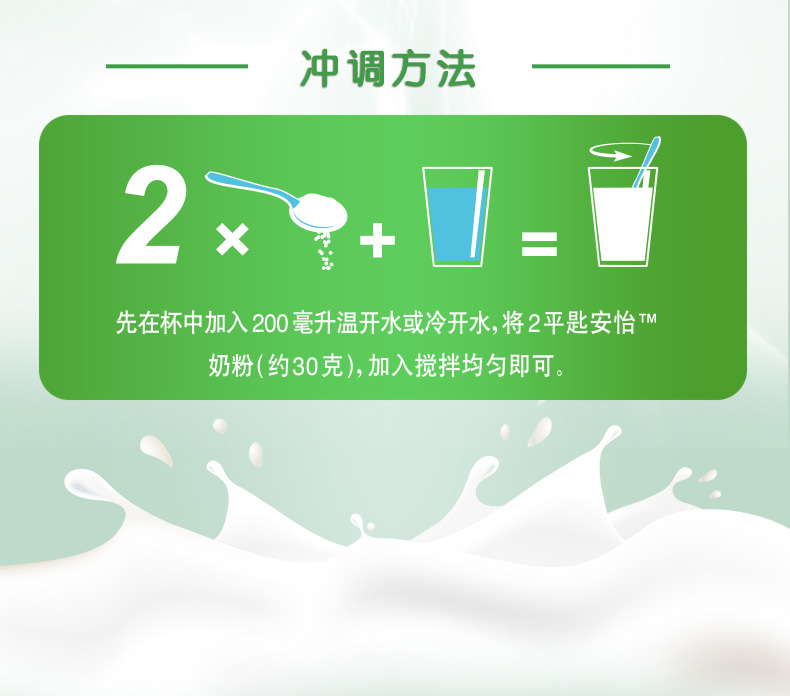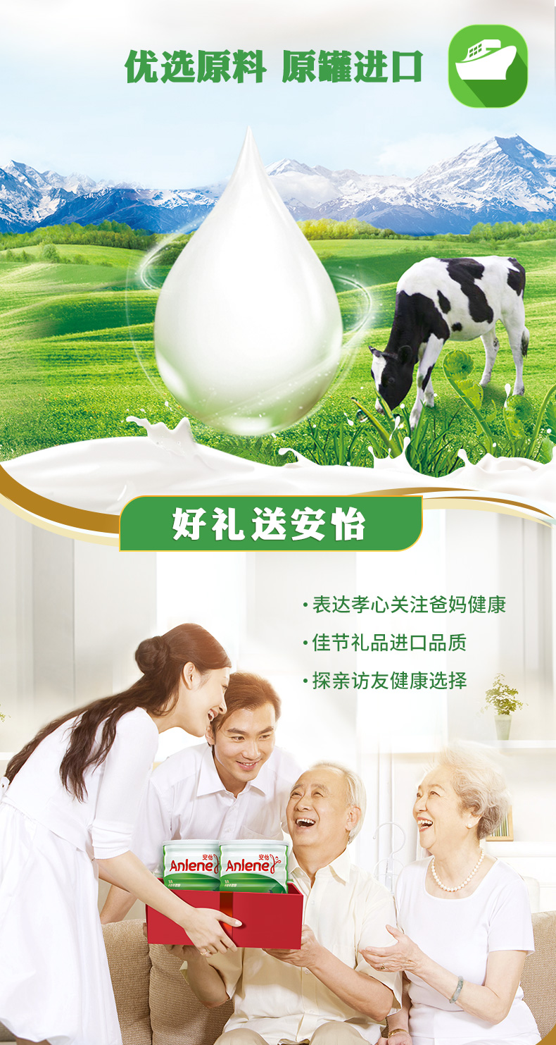 安怡是专门为成年人配制骨骼健康所需营养物质的品牌,是亚洲骨骼健康产品的知名品牌。富含维生素D,添加细小微钙粒子,200ml安怡仅含脂肪0.8g,热量110千卡。取自100%新西兰奶粉,可放心饮用。