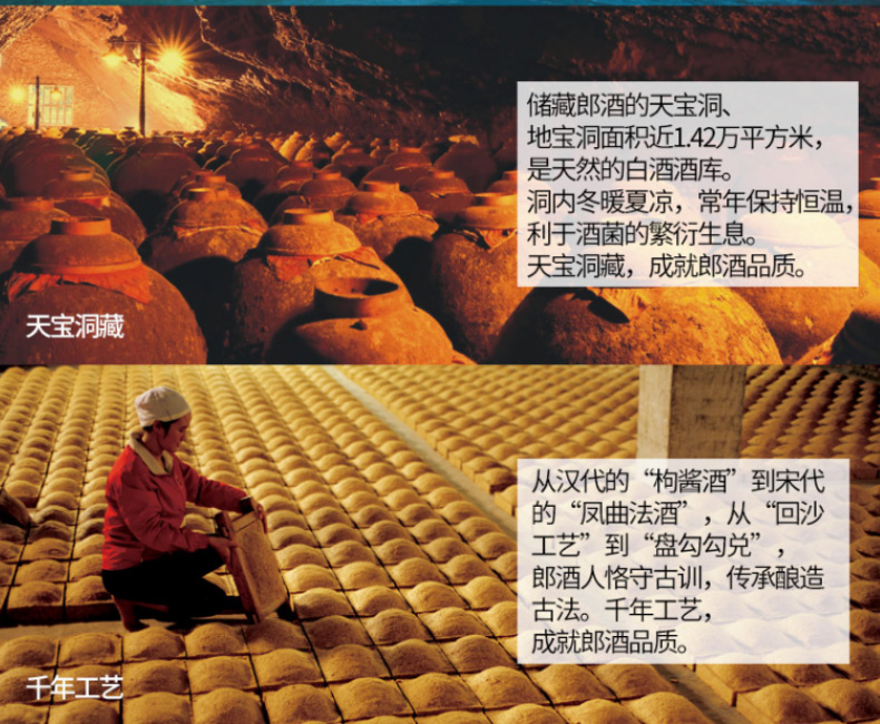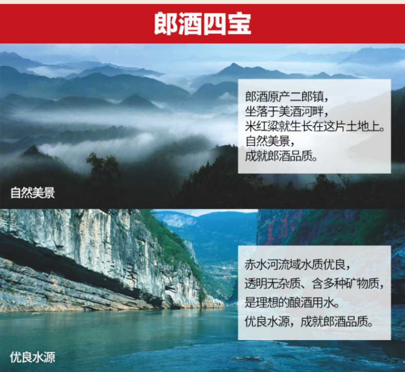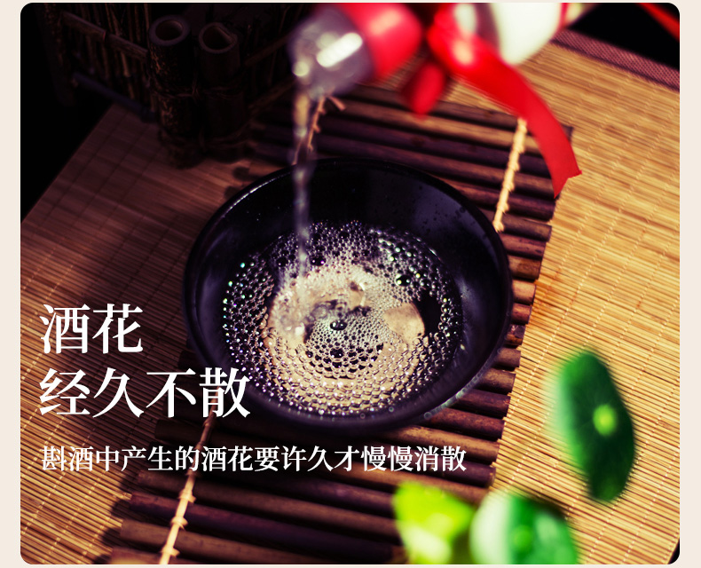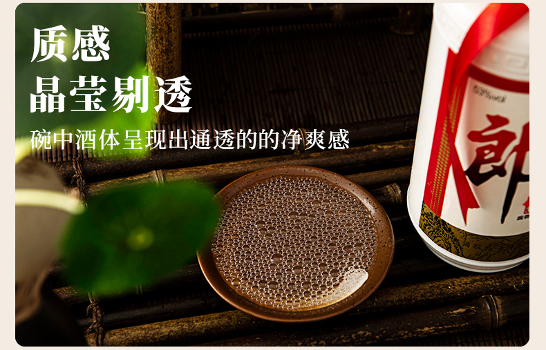 采用赤水河谷的优良水源,甄选川南优良糯红高粱、软质小麦为原料,更是严格遵守郎酒的”四高两长、二九七八“的酱酒传统古法酿造技艺,使斟酒中产生的酒花经久不散,许久才慢慢消散;使酒体呈现出通透的清爽感,显示出晶莹剔透的质感。