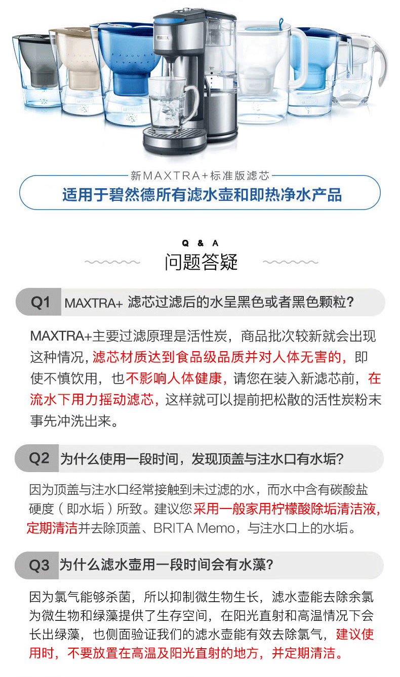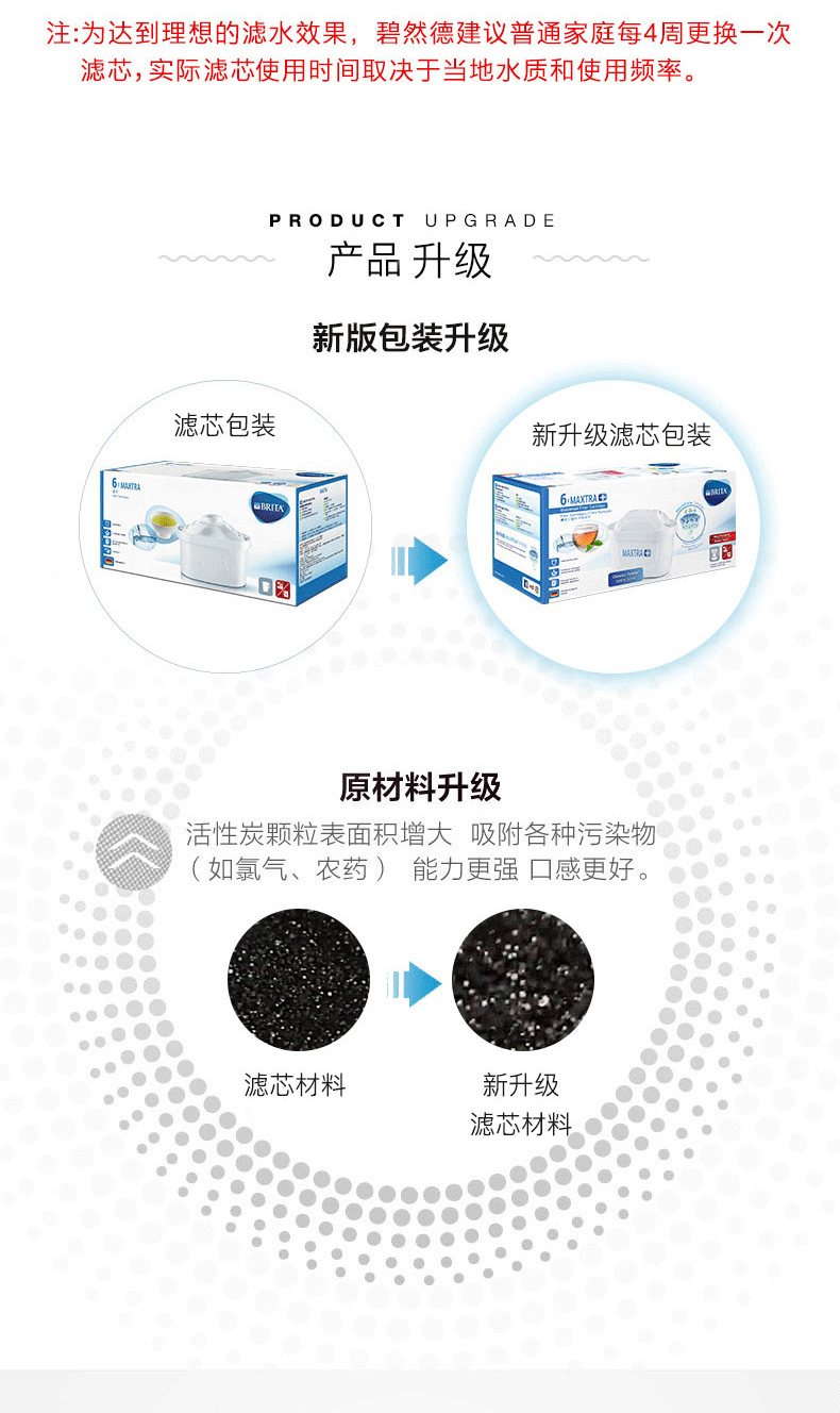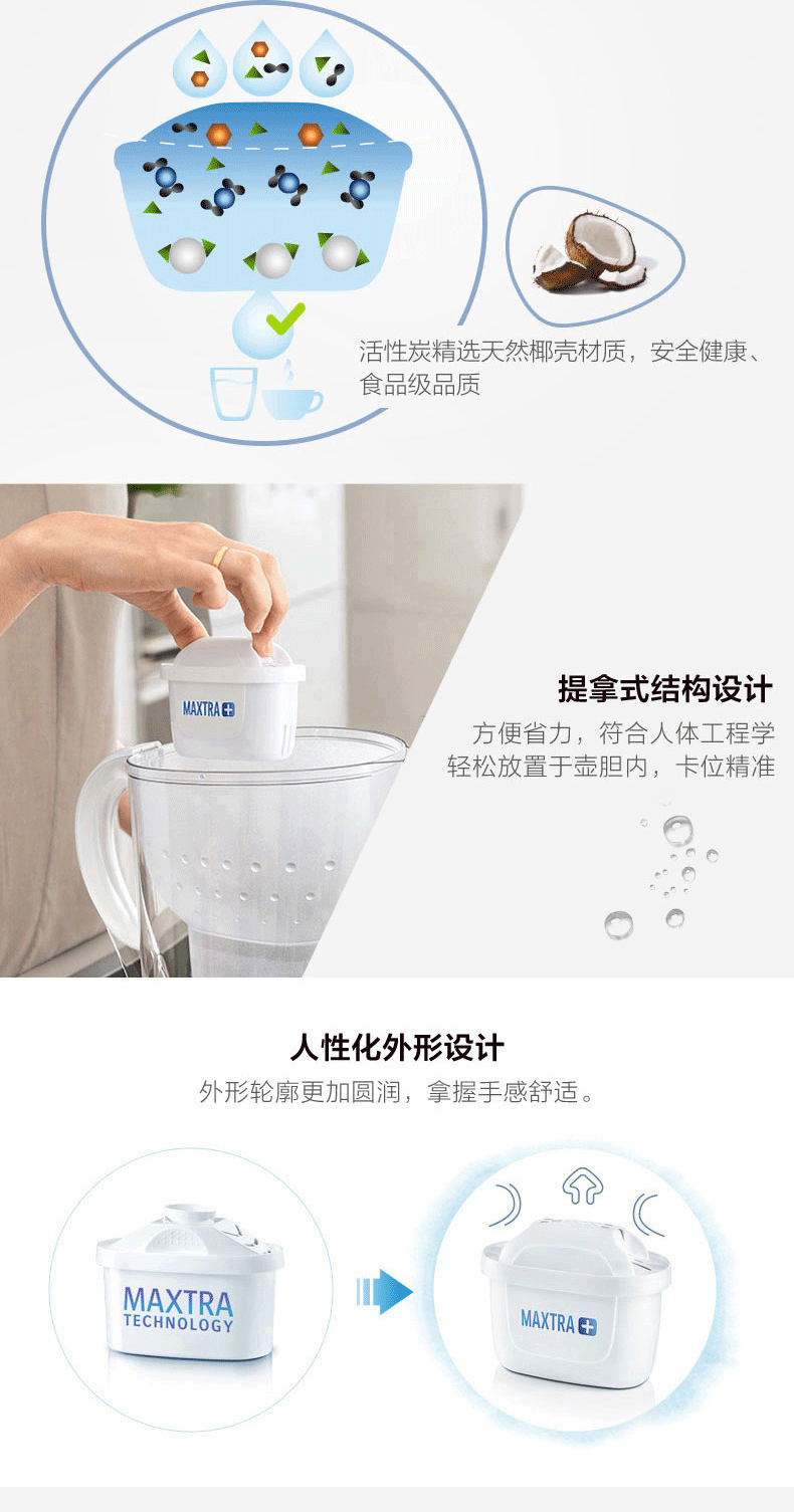 碧然德BRITA 全新升级的三代滤芯“Maxtra+”,内部装填有更大面积的“活性炭颗粒”,可吸附更多污染物,提升过滤效果以及延长使用时间,提升30%滤水效果,适用于目前所有滤水壶,无论新旧。