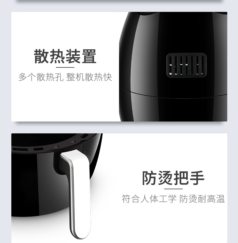 内腔是一体式设计,有不粘油涂层,炸篮和炸锅运用分离技术,按下释放按钮,轻松分离炸蓝和锅底,不粘油更易清洗;锅内容量是3.5L,能满足6-8人可用,一般的空气炸锅只有2L。