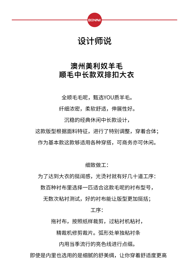 羊毛大衣的羊毛含量,决定了大衣的保暖性能,含量越高保暖性越好。本米的这款大衣,虽然标的是80%羊毛含量,但其实外层面料为100%美利奴羊毛,只是为了使成衣更笔挺有型,内里加衬(聚酯)处理,成衣600克重,保暖足够好的同时,又不会过分沉重,穿起来压身。