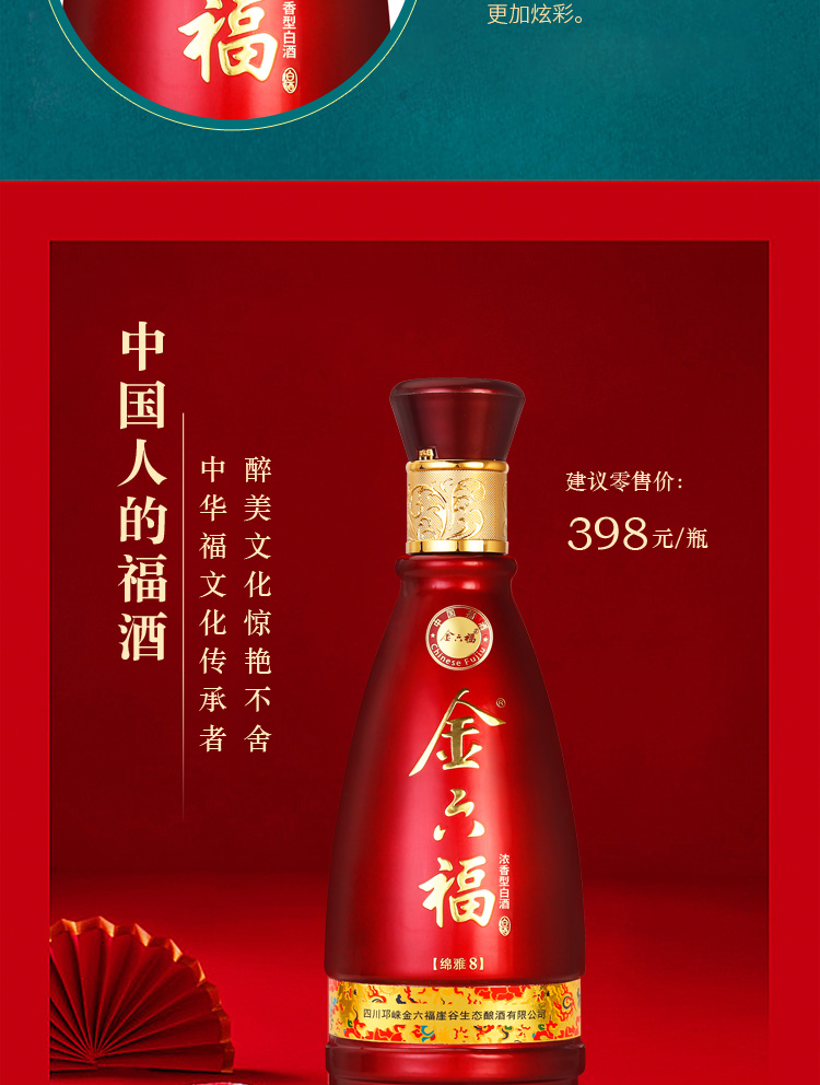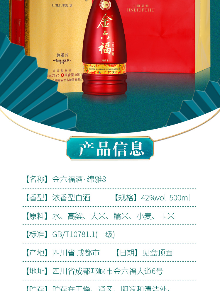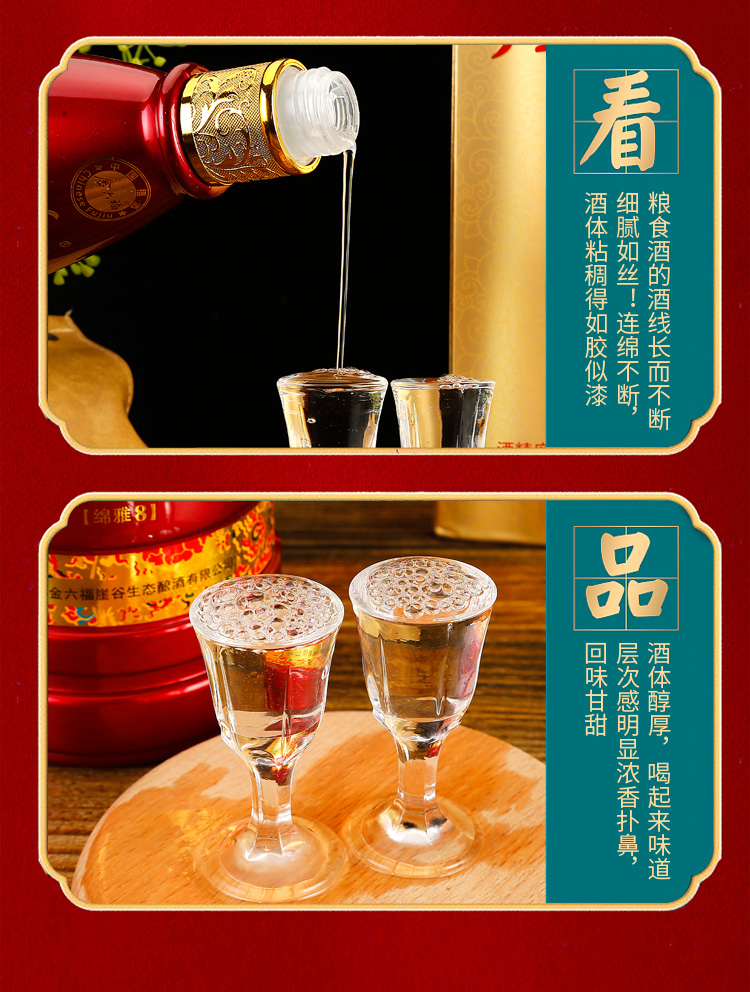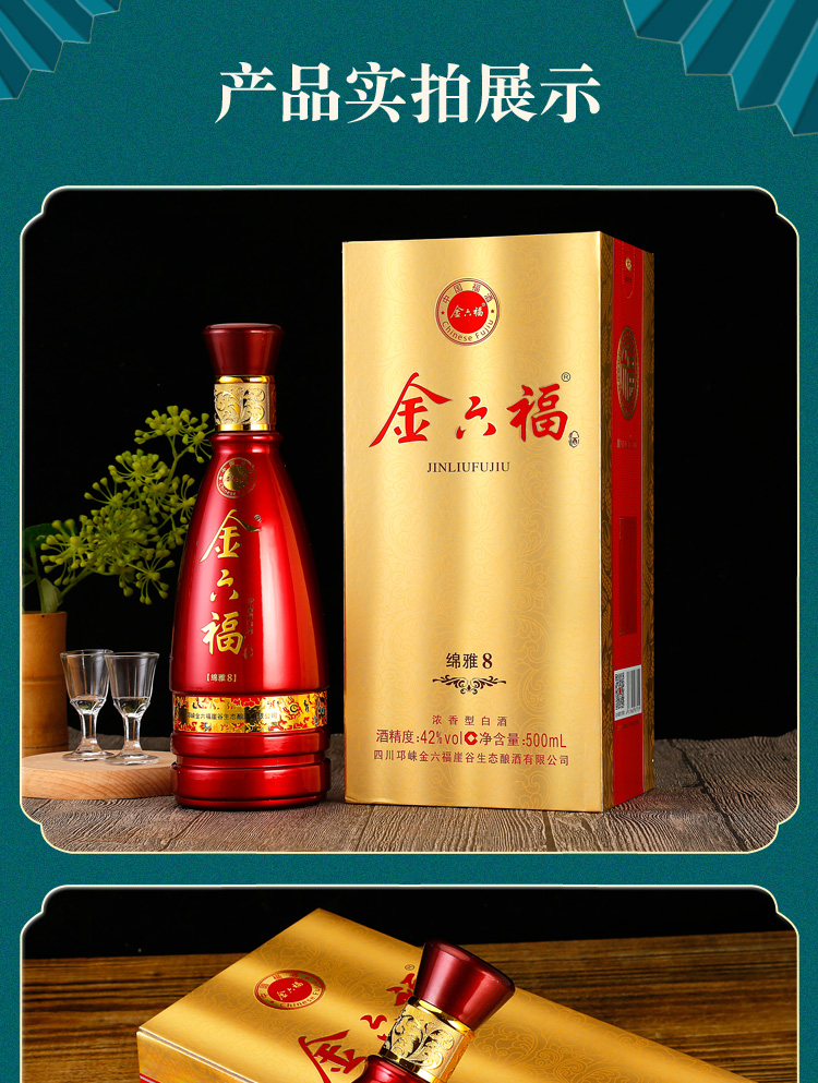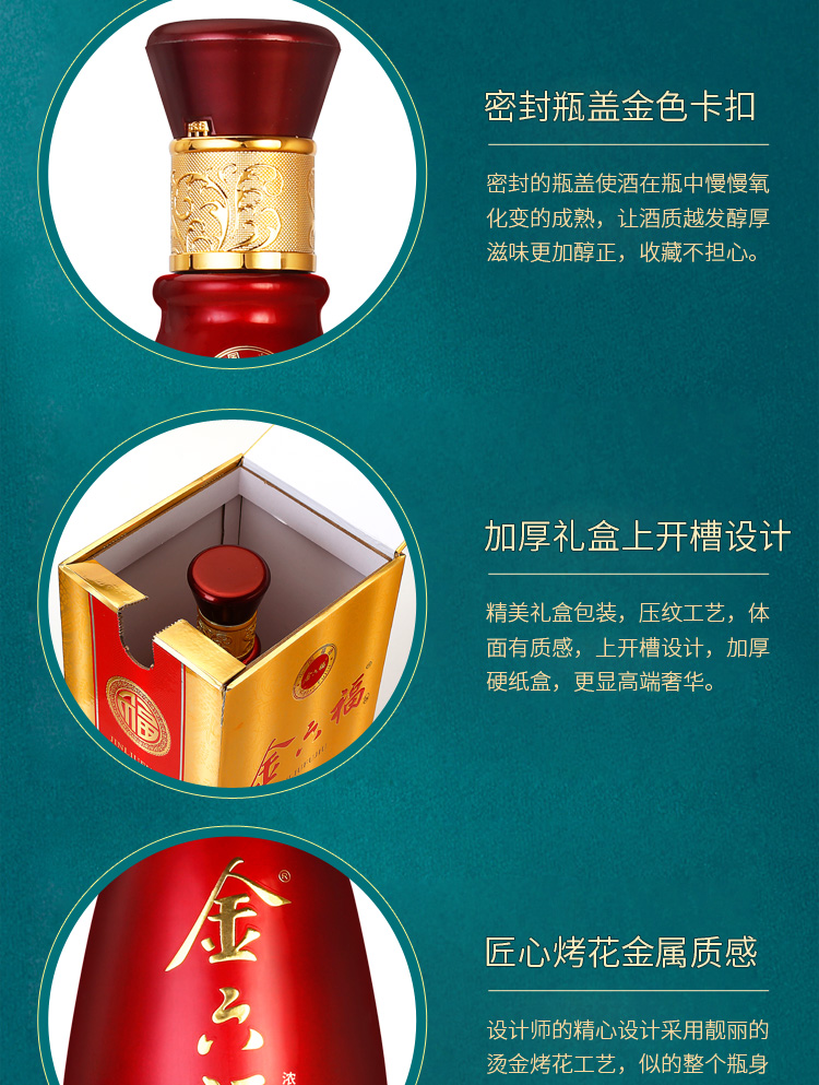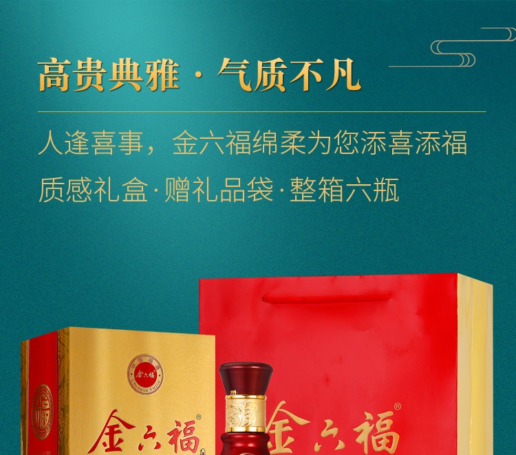 精选优质好粮,精工细酿,酒香浓醇,入口绵柔顺滑,好喝不上头,回味悠长,年货送礼,婚庆不二选择,精选大米,高粱等酿造,入口甘美,入喉爽静。金六福红金搭配设计,体现了温暖、喜庆。