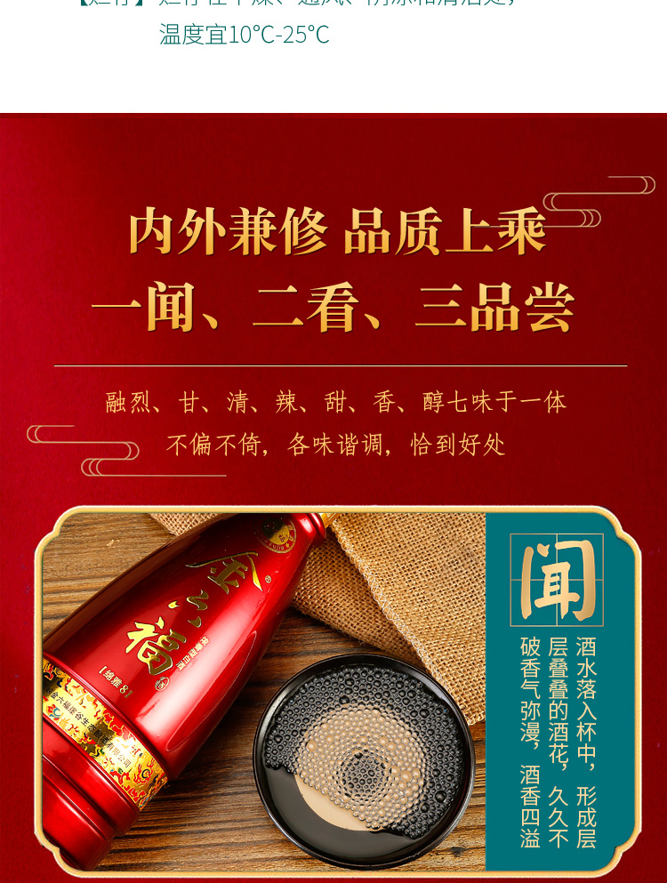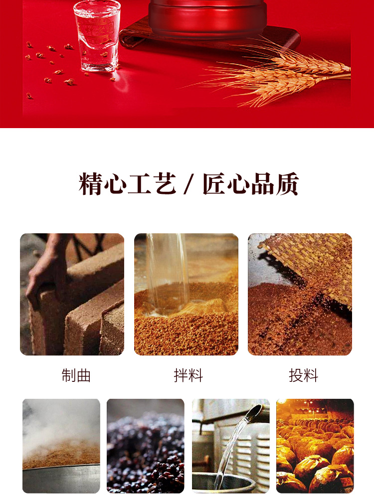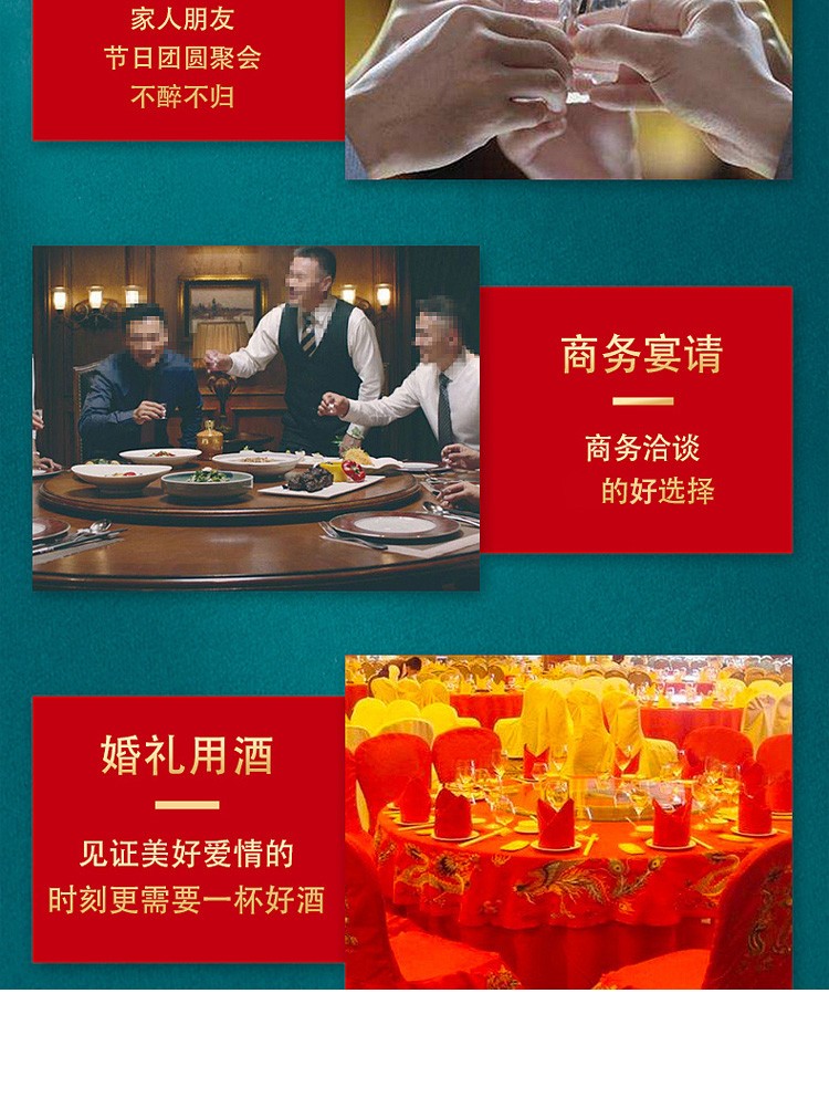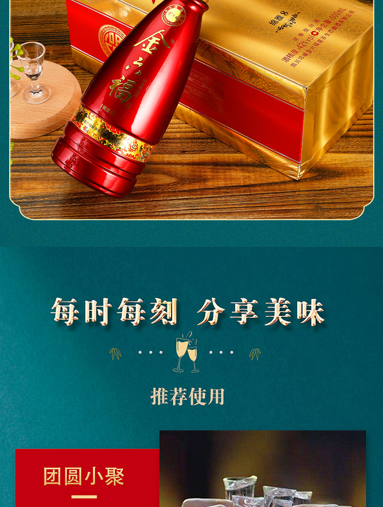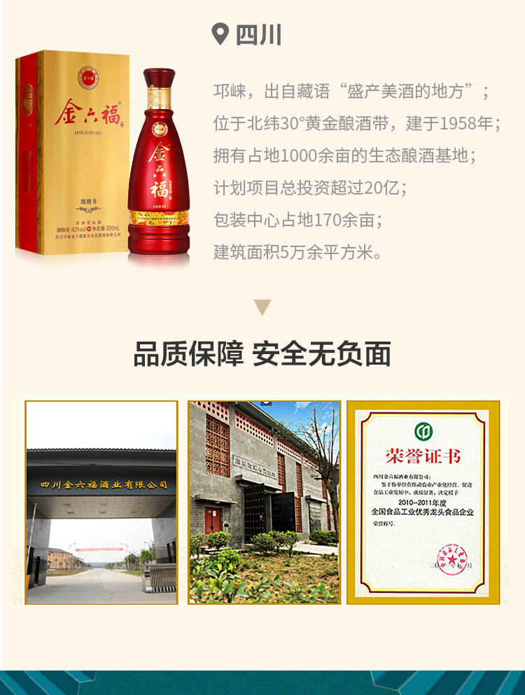 精选优质好粮,精工细酿,酒香浓醇,入口绵柔顺滑,好喝不上头,回味悠长,年货送礼,婚庆不二选择,精选大米,高粱等酿造,入口甘美,入喉爽静。金六福红金搭配设计,体现了温暖、喜庆。