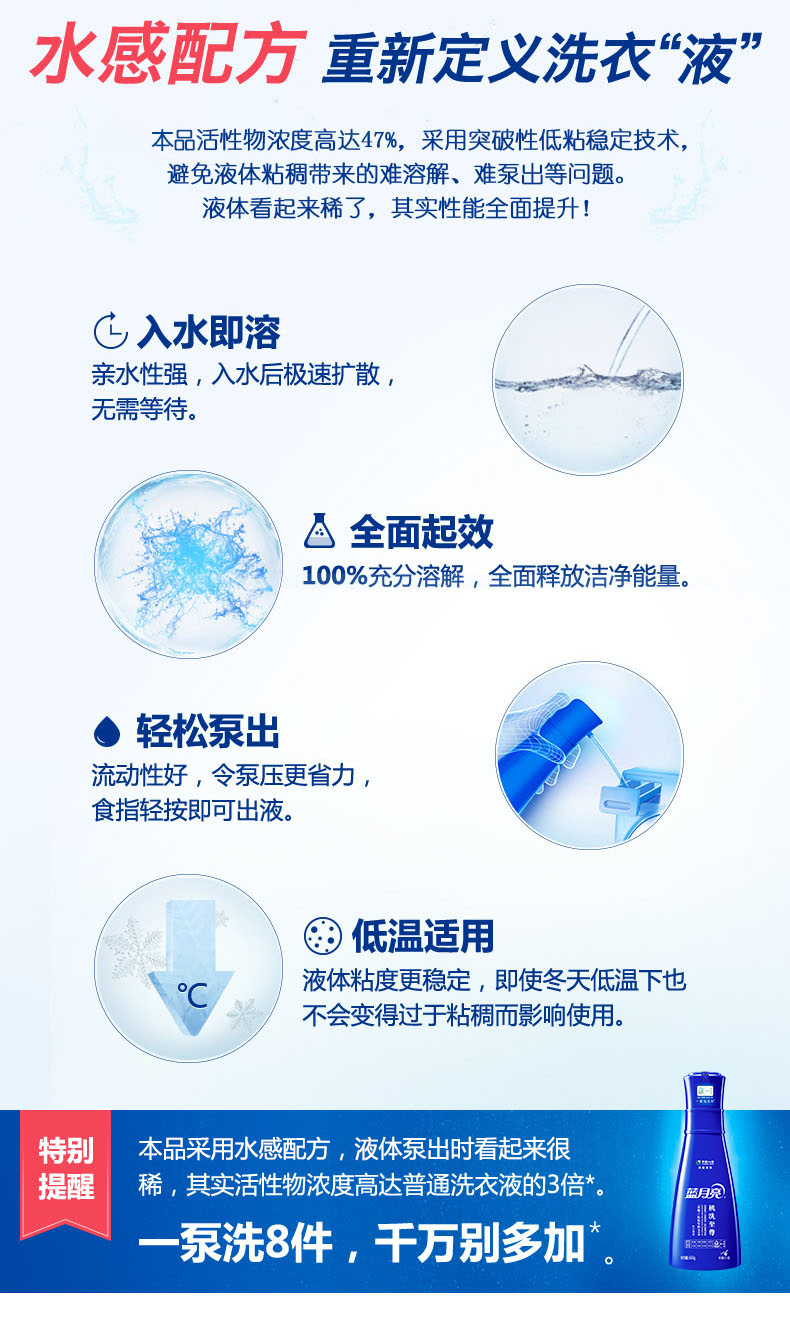 机洗至尊活性浓度高达47%,采用突破性低粘稳定技术,避免液体粘稠带来的难溶度、难泵出等问题。亲水性强,入水后急速扩散,入水即溶,100%全面起效,全面释放洁净能量;突破性高效洁净因子和活性物,深层去渍去污,防止再附着。