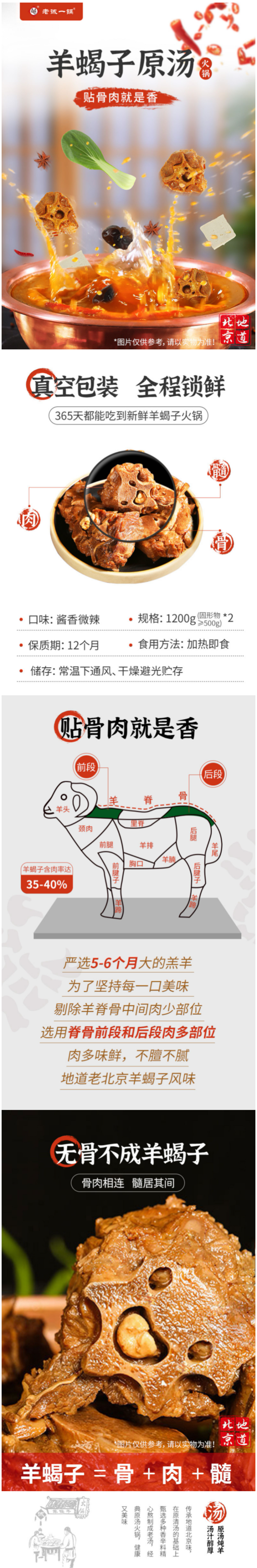 这款老诚一锅酱香微辣羊蝎子火锅,来自于180天的内蒙古羔羊,使用物理切割,骨少肉多,经过排酸、蒸煮、卤制、121℃高温杀菌封装,口感香嫩,肉质鲜而不膻,肉鲜嫩骨髓多,搭配汤料,加热即食。
