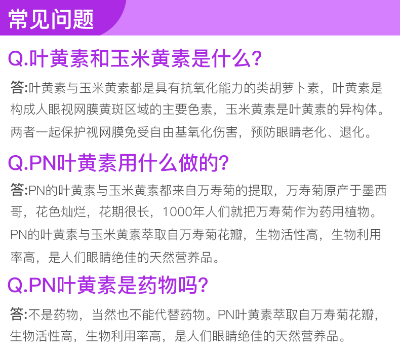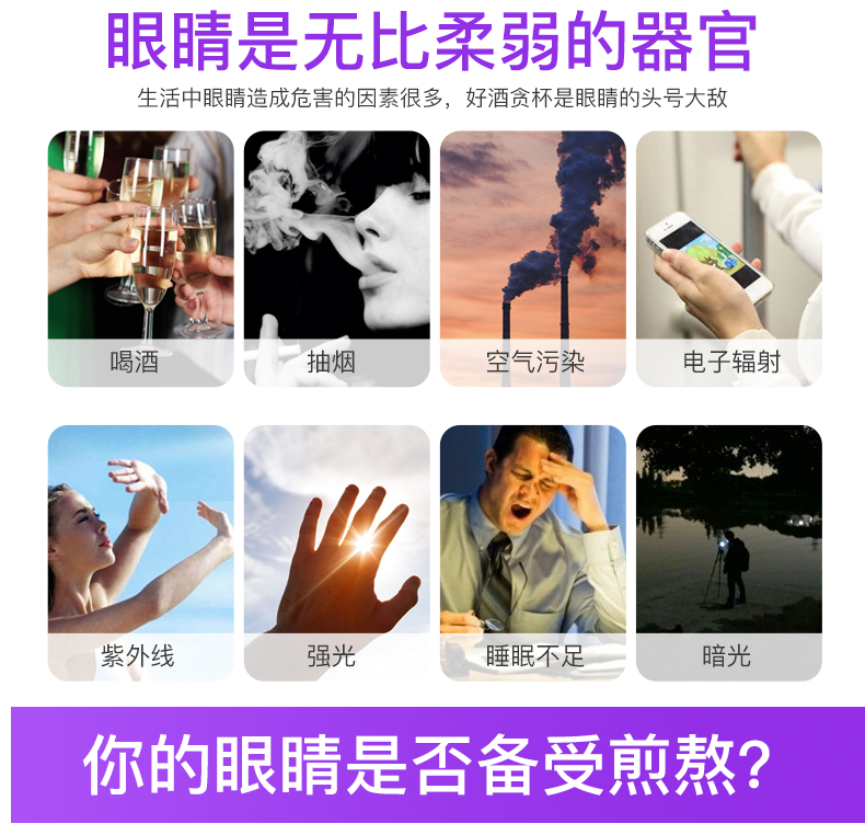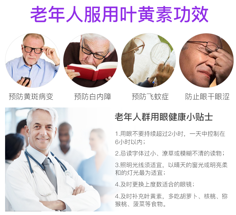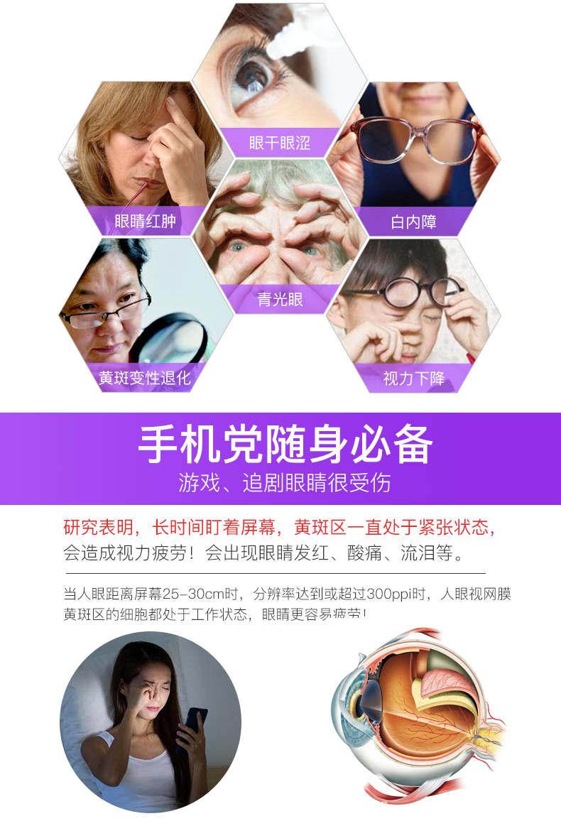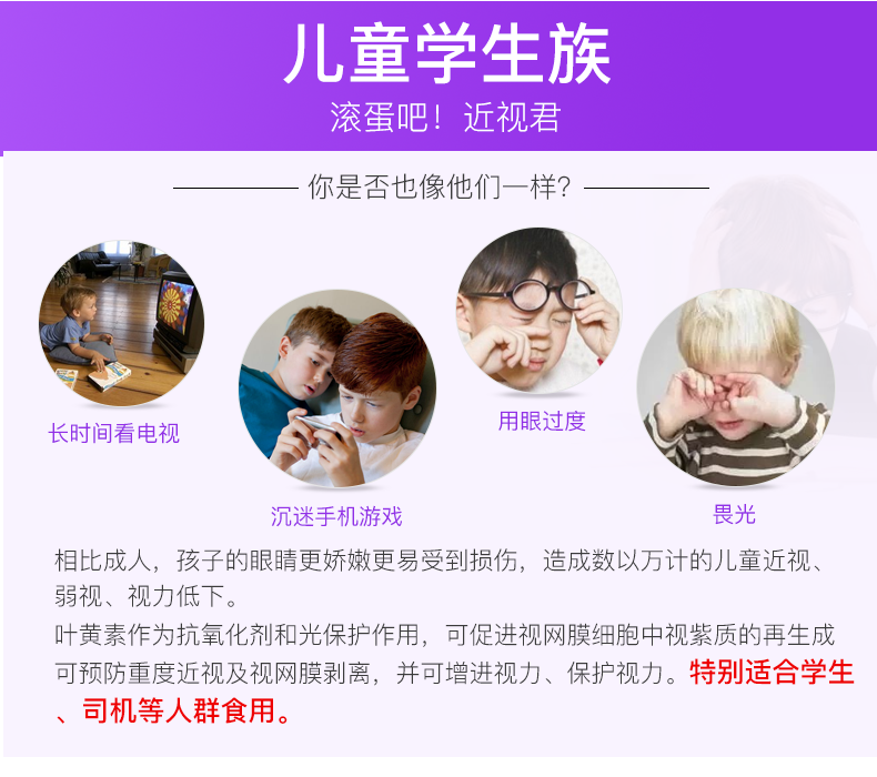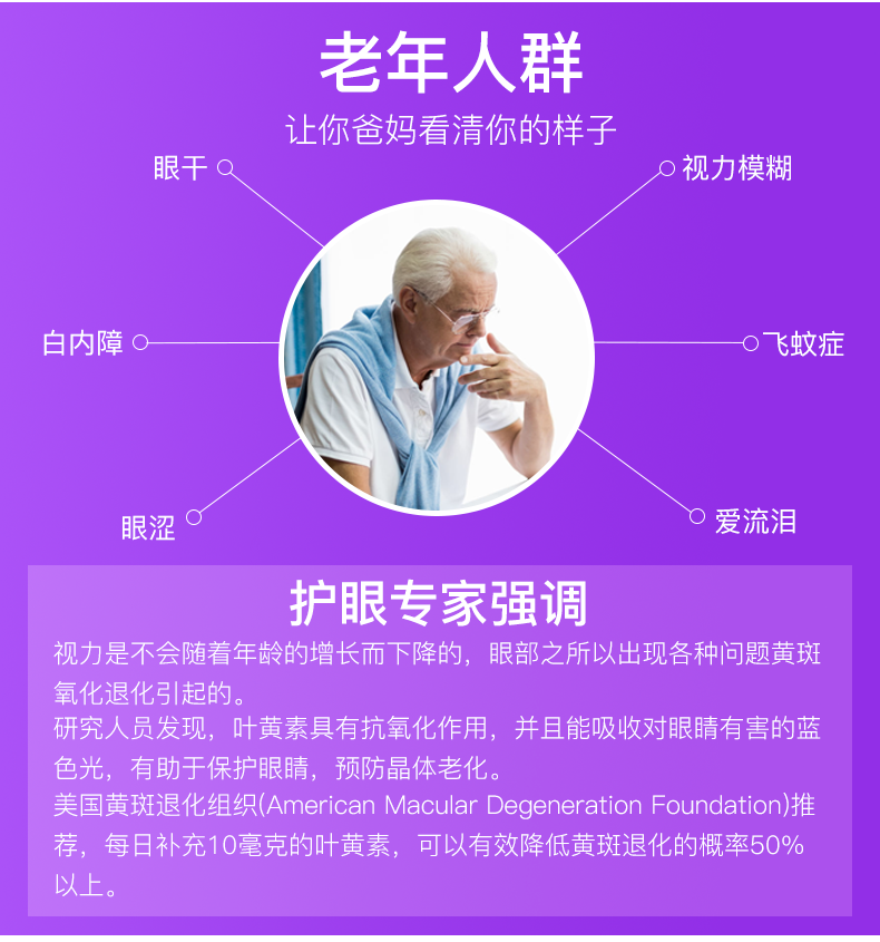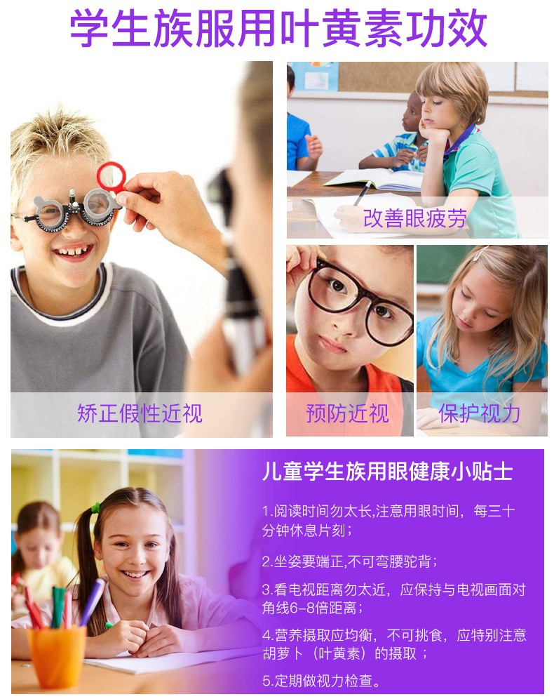 叶黄素作为抗氧化剂和光保护作用,可促进视网膜细胞中视紫质(Rhodopsin)的再生成,可预防重度近视及视网膜剥离,并可增进视力、保护视力,缓解视疲劳症状。特别适合学生、司机、电脑办公人员和游戏达人等食用。