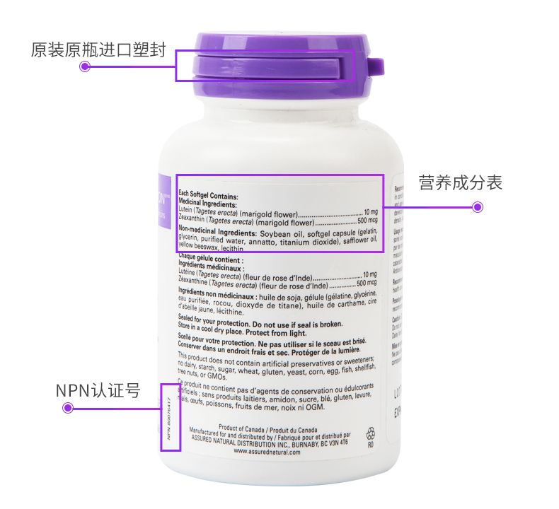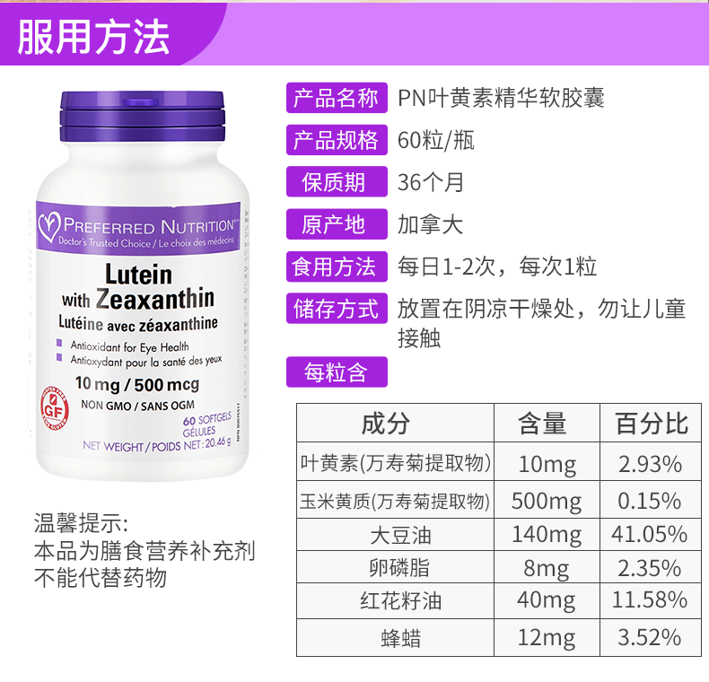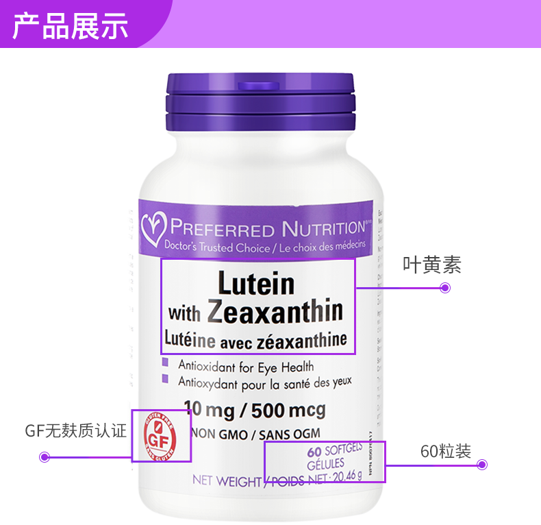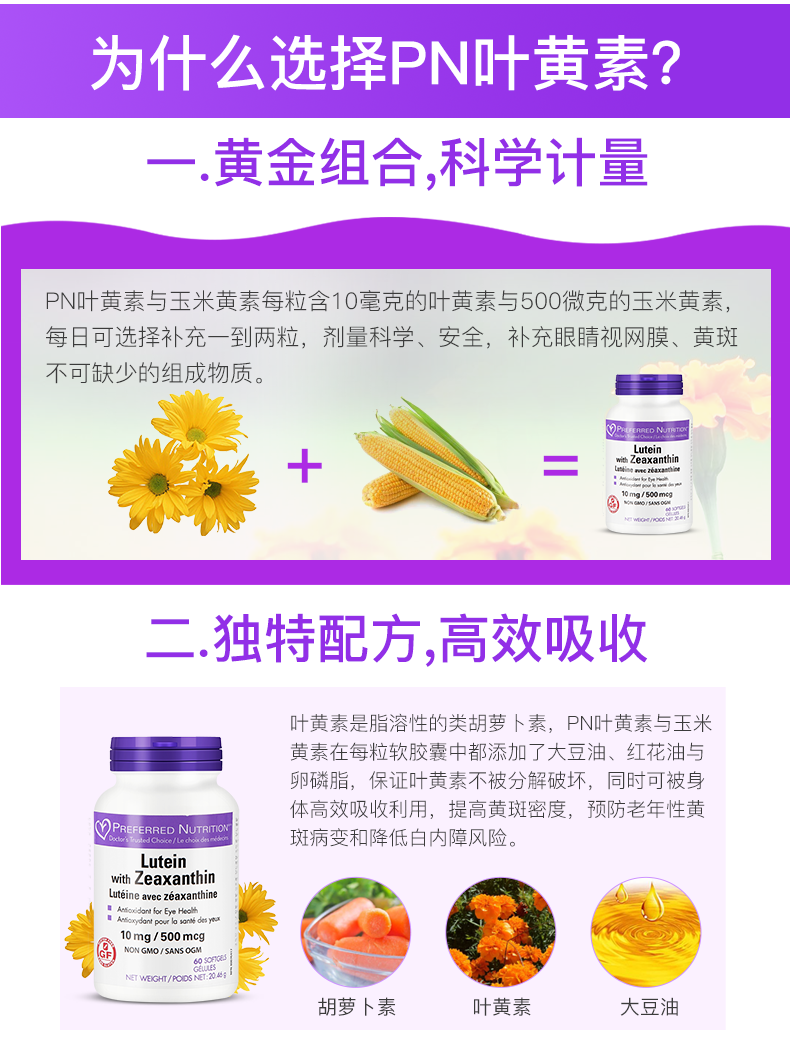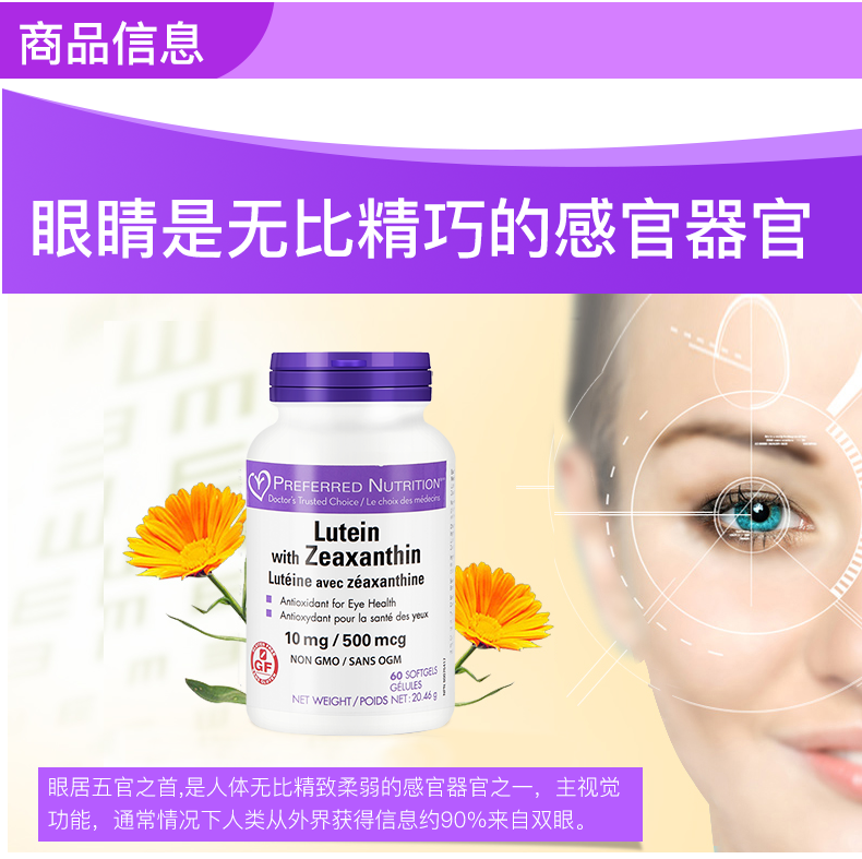 这款Preferred Nutrition叶黄素精华胶囊主要有效成分为叶黄素、玉米黄质,在每粒胶囊中都添加了大豆油、红花油和卵磷脂,保证叶黄素不被分解破坏,同时可被身体高效吸收利用,提高黄斑的密度,有效成分提取自万寿菊花瓣,生物利用率高,预防市里退化。