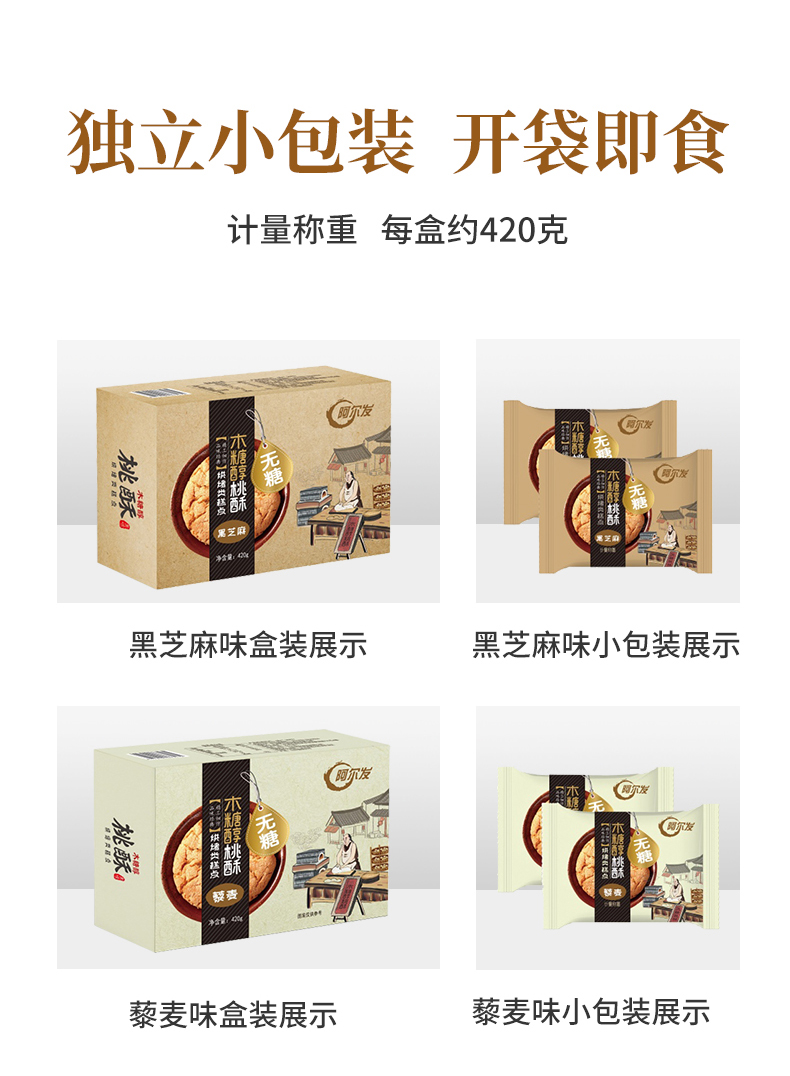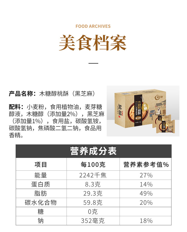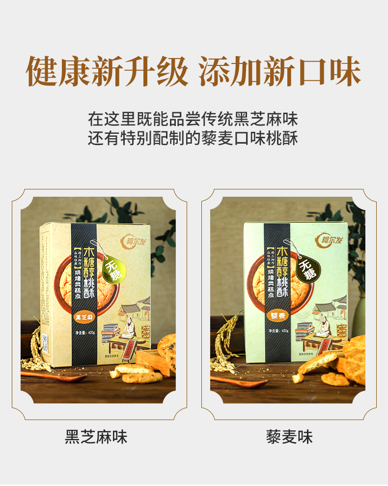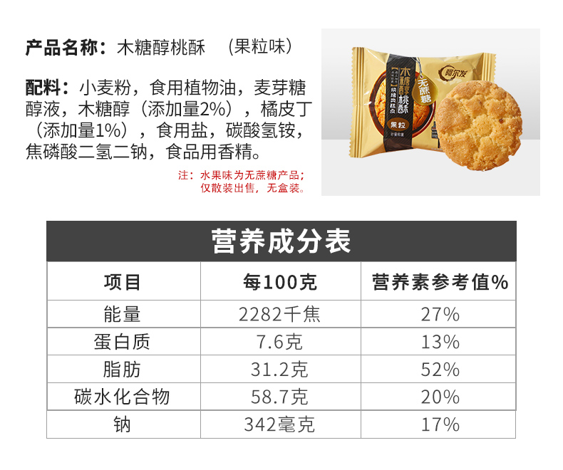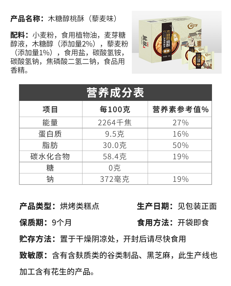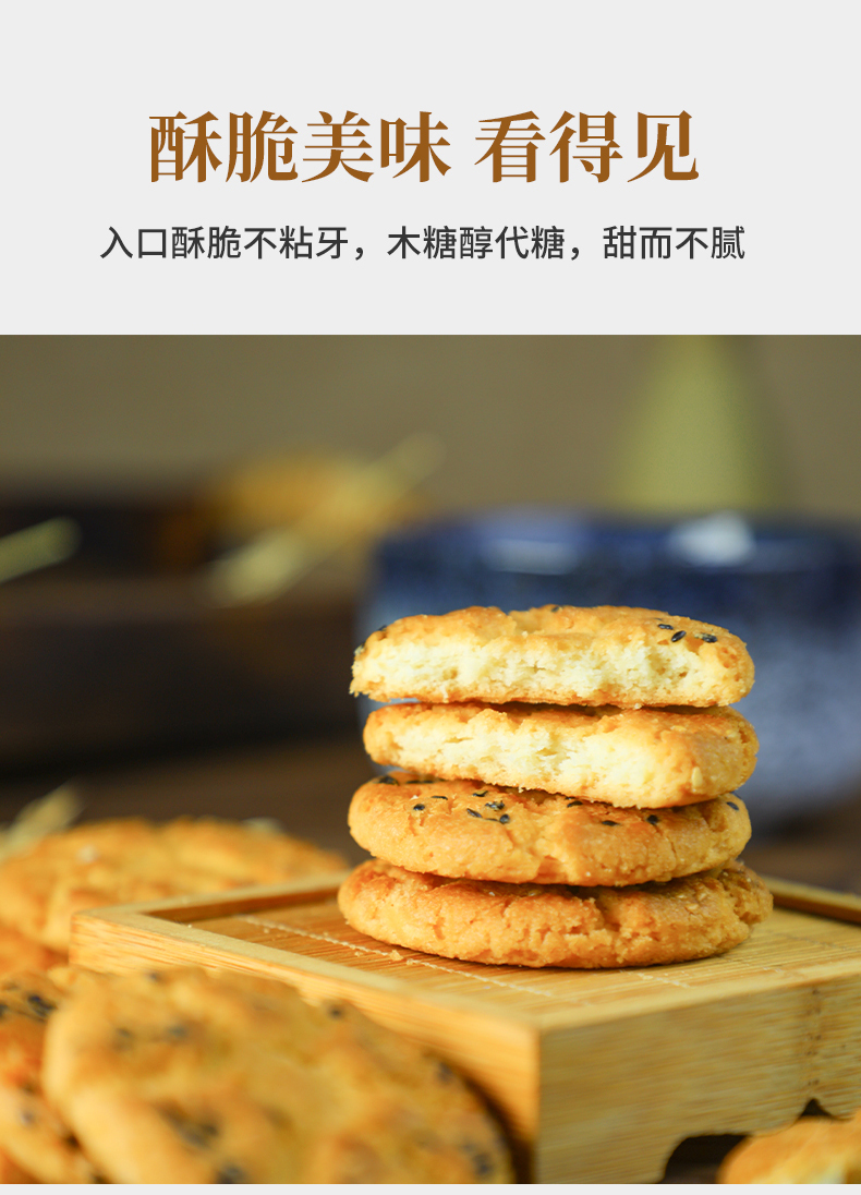 这款阿尔发 无糖黑芝麻桃酥,使用优质小麦粉、食用植物油、黑芝麻、藜麦粉为原料,木糖醇代糖,甜而不腻。精心烘焙非油炸,无糖,入口酥脆不粘牙也更健康。