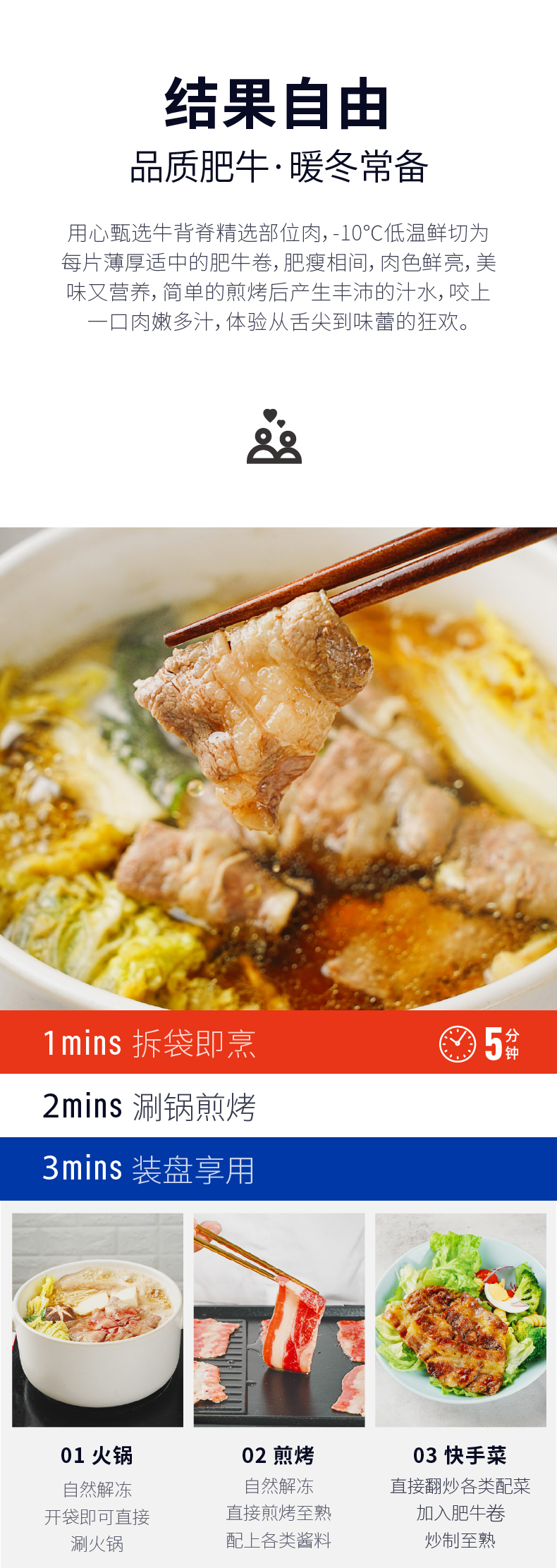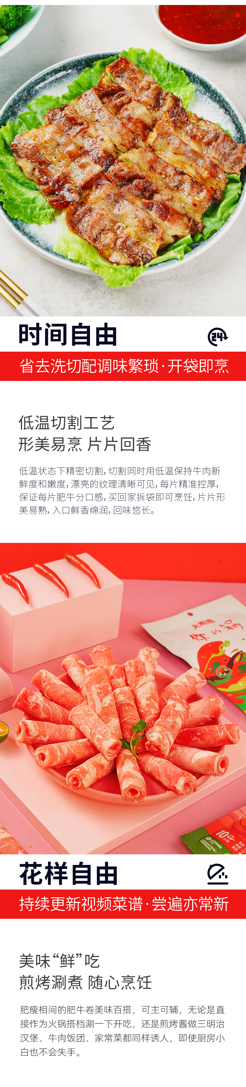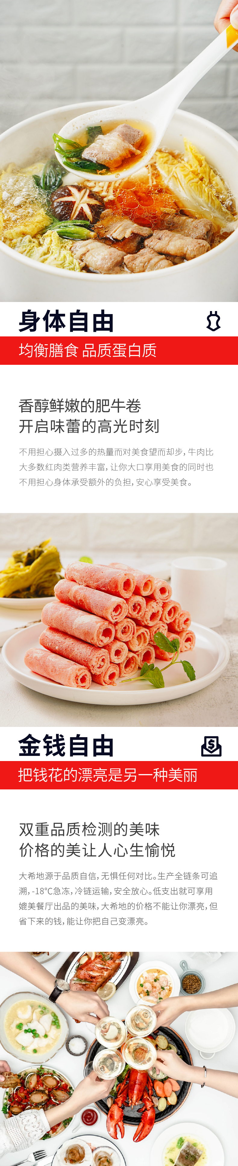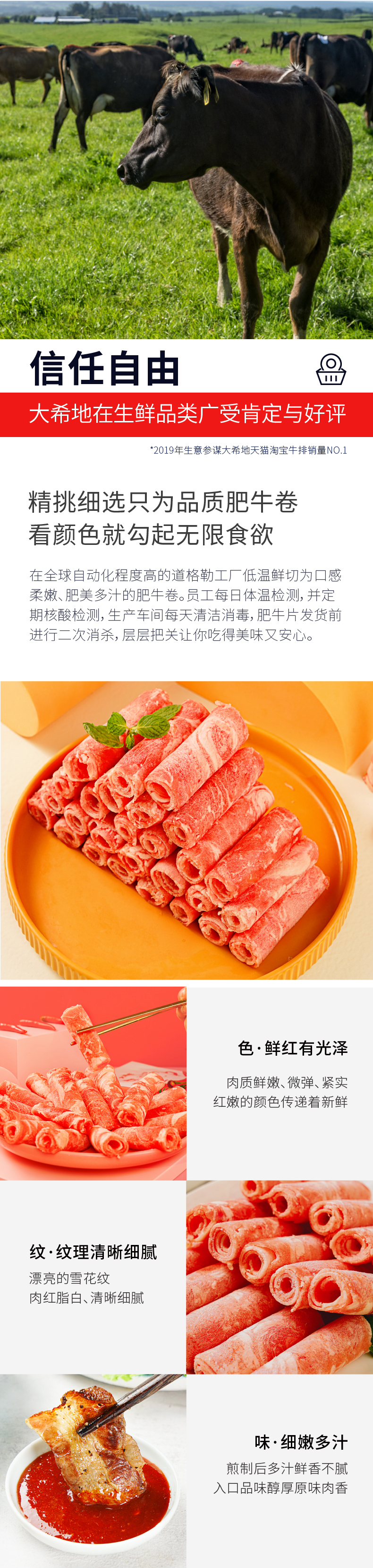 大希地的肥牛卷,严选天然育肥的小牛,选牛胸脊部位,牛肉肉质细嫩,雪花丰富,入口绵润,有淡淡奶香,低温状态细密切割,非碎肉压制,不掺假,无添加。肥瘦均匀,5秒涮烫即食,下锅不散不碎,全国多仓发货,定期检测,食用放心。