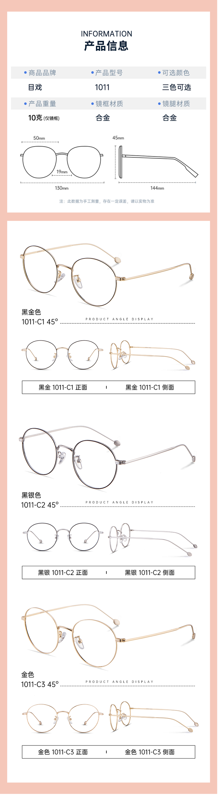 这款宝旗下目戏镜框,男女都可佩戴,镜框采用10g超轻合金材质制成,佩戴舒适无压力。圆形镜框设计,时尚修颜,戴上后显得清新可爱。镜腿内弯设计,不夹脸不易掉。