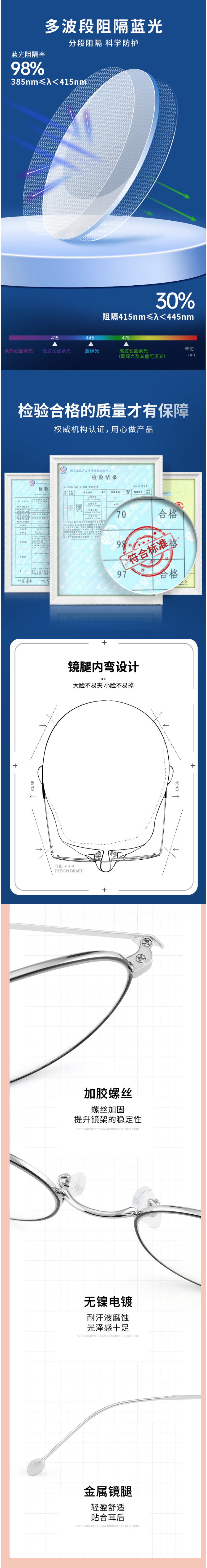 镜架有7°向内倾角,改变镜架在鼻梁上的重心点,防止眼镜框下滑。双层软硅鼻托,减压无红印、支撑力度强。