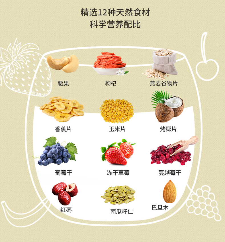 这款优佳 即食混合谷物坚果脆麦片,水果谷物搭配配方,使用非膨化麦片为主料,富含膳食纤维易饱腹,搭配腰果、枸杞、香蕉片、玉米片、烤椰片、葡萄干、冻干草莓、蔓越莓干、红枣、南瓜籽仁、巴旦木,不额外添加蔗糖,营养均衡,不含人工添加剂,适合健身代餐。