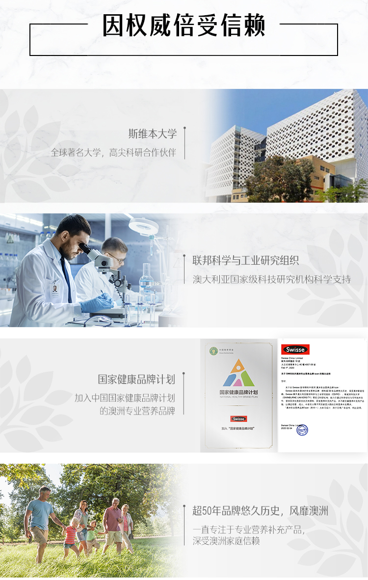 Swiss是近两年风头很盛的自然健康品牌,于1960年在澳大利亚墨尔本创建,号称澳洲顶级保健品,同时也是澳洲自然医学疗法的先驱之一,公司主旨是倡导缔造健康和高品质生活,有超过25年的科学研究和临床试验的基础,其原料采购和生产工艺均通过全球最高处方药的生产标准TGA。