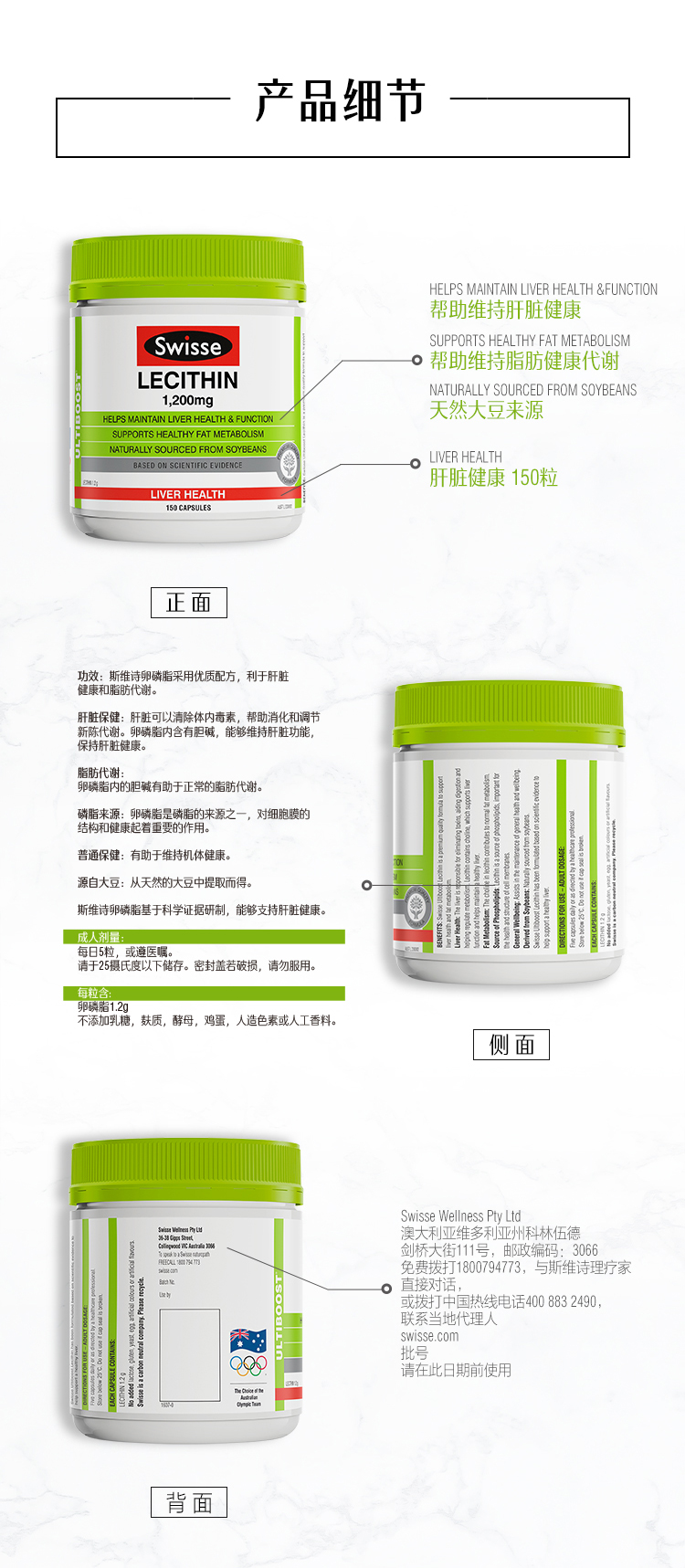这款Swisse大豆卵磷脂胶囊,澳洲进口,具有分解多余胆固醇、清理血管垃圾、降低血糖、预防老年痴呆、帮助预防和改善动脉硬化、增强脑神经活力提高记忆力的功效。适用于高血脂、心血管疾病人群,记忆力下降人群,经常饮酒,有脂肪肝及肝脏疾病人群,免疫力欠佳的中老年人群。