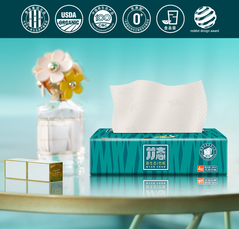 这款竹态 象牙白原生竹浆抽纸,精选天然原竹,美国有机认证,限定专属北纬30°有机竹林,位于得天独厚的川贵竹源地,坚持优选生长2年以上有机竹,纤维长、格外有韧性,蕴含抑菌竹醌,无添加不漂白,可直接接触肌肤。155°C超高温高压蒸煮物理消毒,获得13项制浆造纸国家专利。4张加厚,一张抵2张,精致压花。产品尺寸:152mmx190mm 规格: 4层/70抽*12包