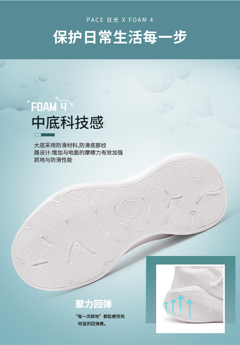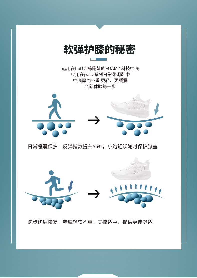 核心是FOAM 4科技中底,从轻便、柔软、弹性和持久这四个方面进行改善,降低鞋底硬度,增强了护膝效果,使其更加柔软轻弹,带来如踩云端的超软弹脚感。