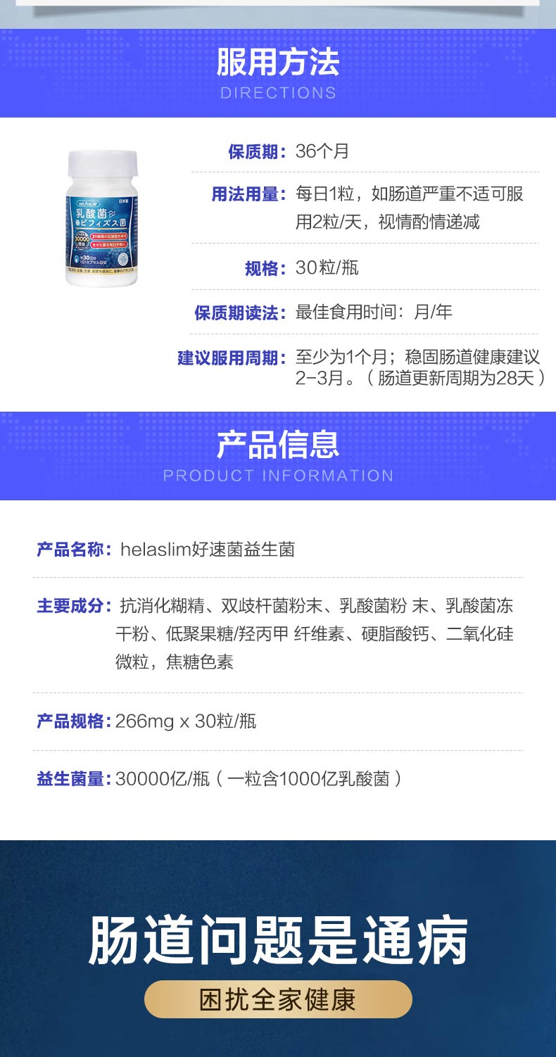这款Helaslim 好速菌益生菌,日本产,规格30粒/瓶,包含22种不同的自然衍生的益生菌菌株,其中包括两大明星菌株:日本BB536双歧杆菌及日本EC-12乳酸菌,每粒含1000亿活性益生菌,不仅支持健康的肠道菌群的微生物平衡,但协助身体的自然消化过程,促进营养物质的吸收,并有助于增强人体免疫功能,保持消化系统和肠道健康,同时添加丰富膳食纤维,清宿便,促进肠道排空。胶囊型益生菌,无惧胃酸胆碱侵蚀,直达肠道。
