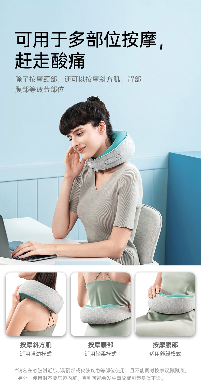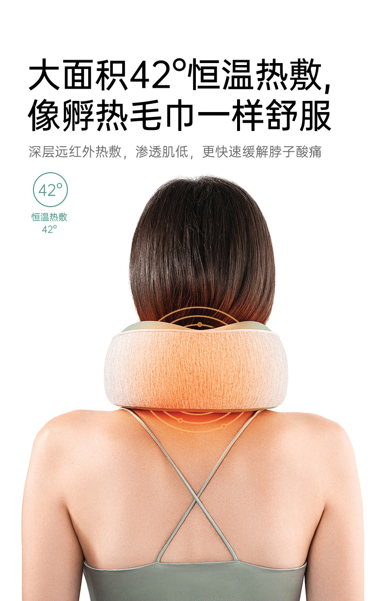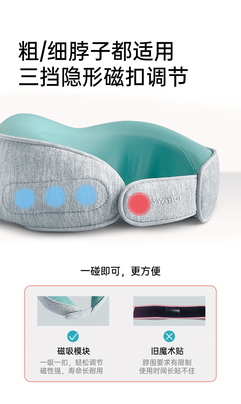 有快、中、慢三档按摩模式,在配合远红外技术、恒温热敷,有助放松颈部肌肉,舒适解乏。三档隐形磁吸扣调节,佩戴舒适。内置2500mAh容量电池,每次15分钟满电可用8天,枕套纯棉亲肤面料可拆卸打理方便。