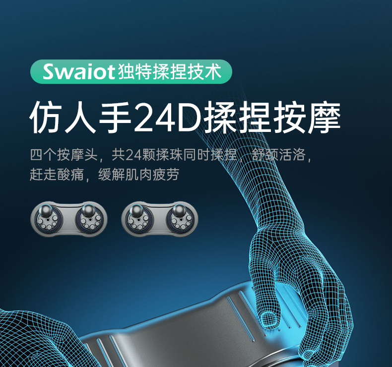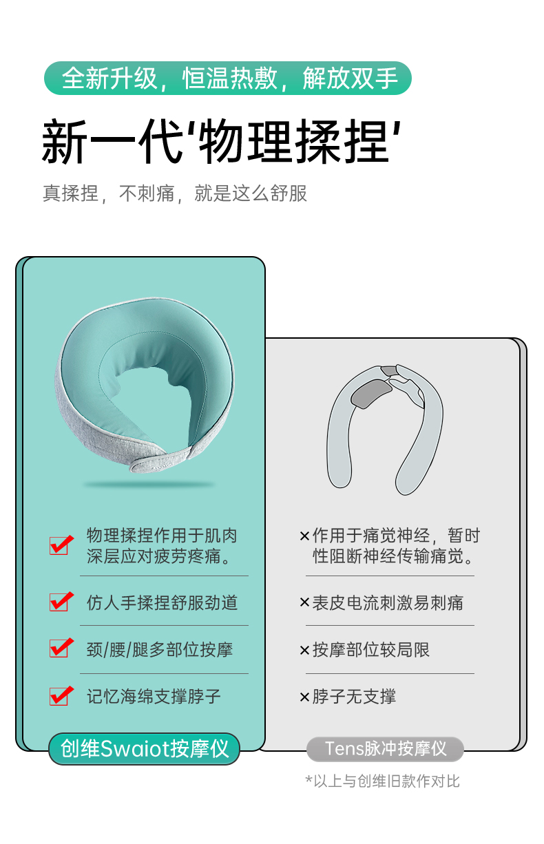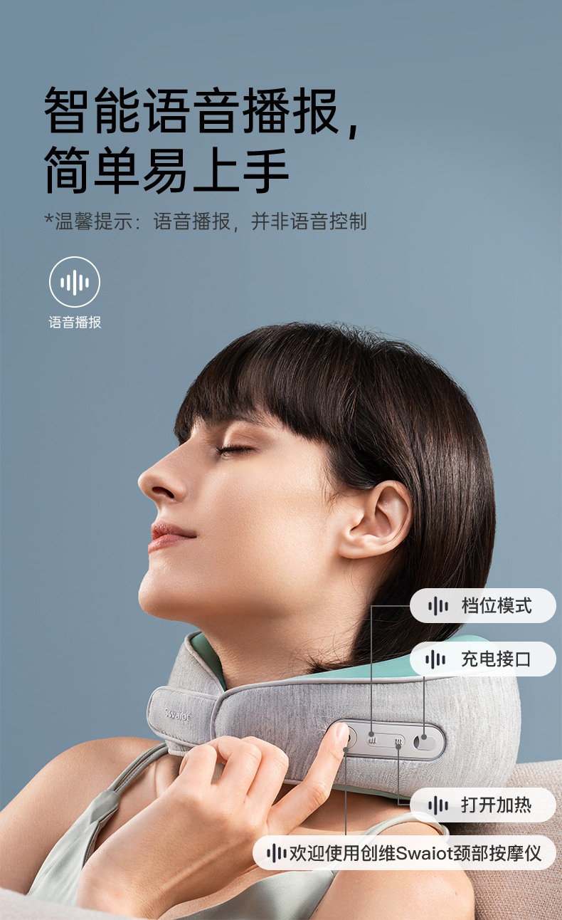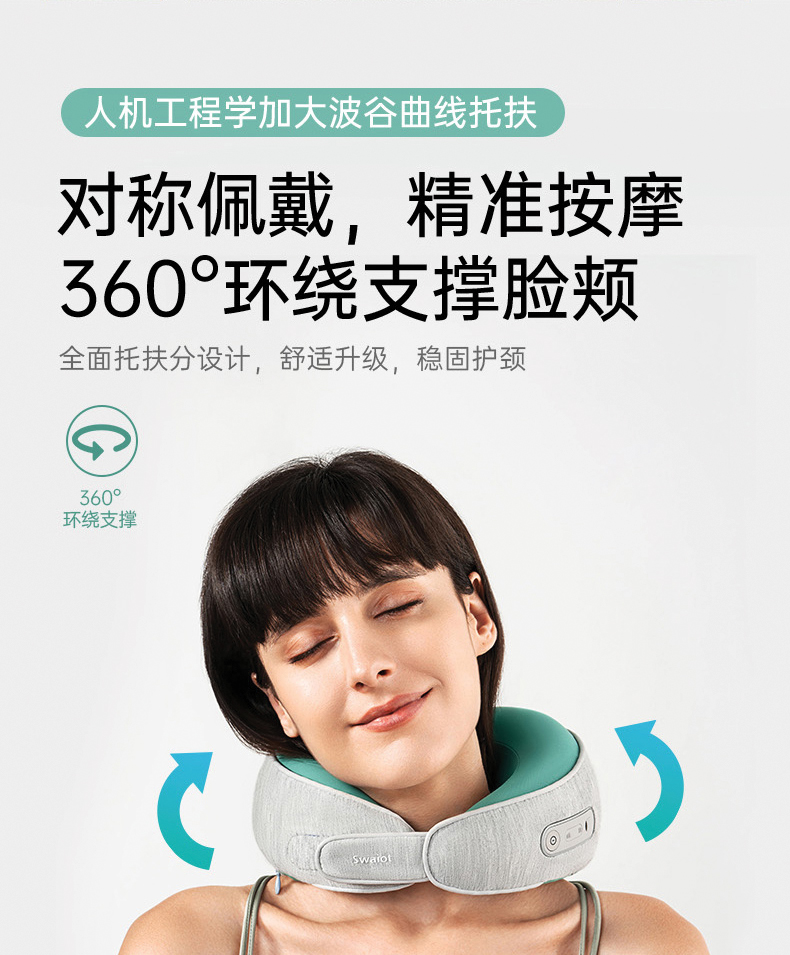 新一代颈部按摩仪,360°环抱承托,内置记忆海绵,具有非常好的支撑性和回弹性,科学支撑缓解颈部压力。内置4组按摩头,24个揉珠触点,通过正转/反转,模仿十指揉捏按摩,刺激穴位,舒经活络,赶走酸痛,缓解颈部肌肉疲劳。智能语音播报+炫彩灯带提示,老人也可轻松操作。