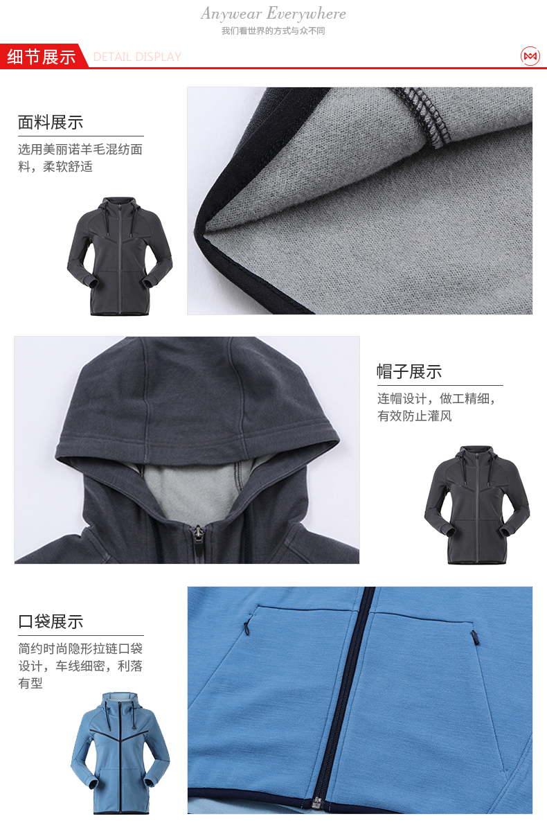 这款地球科学家男女休闲连帽外套是春秋款,采用69.6%聚酯纤维+25.9%美利奴羊毛+4.5%弹力氨纶混纺而成,衣服摸起来的手感非常柔软完全不会不扎人,还有速干透气抗异味的功效。