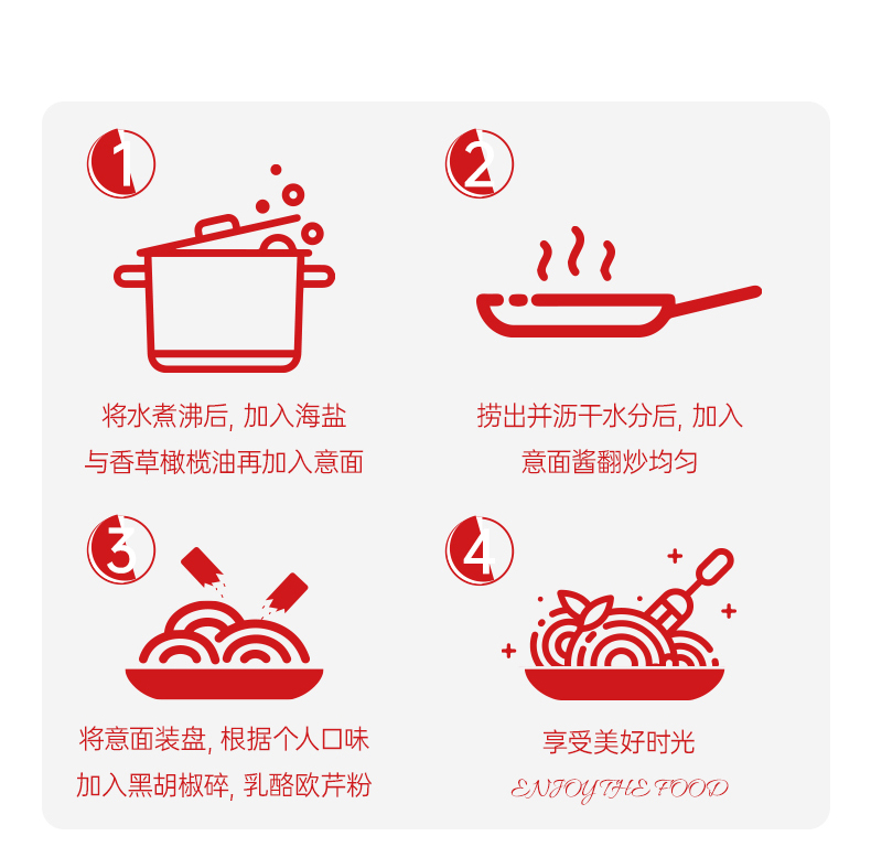 制作方面也很简单方便,无需复杂配方,只需煮熟搭配各种口味的意面酱,点缀一些水果蔬菜,一盘完美的意大利面便制作完成了。