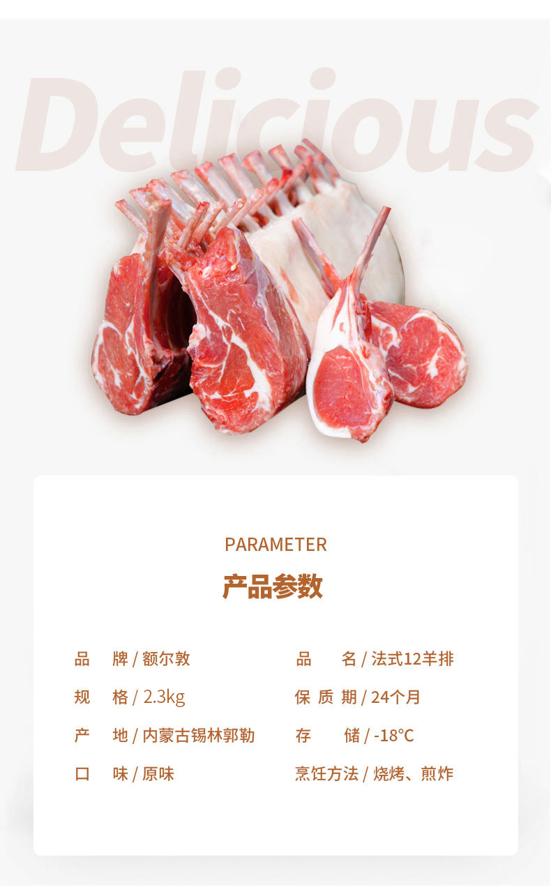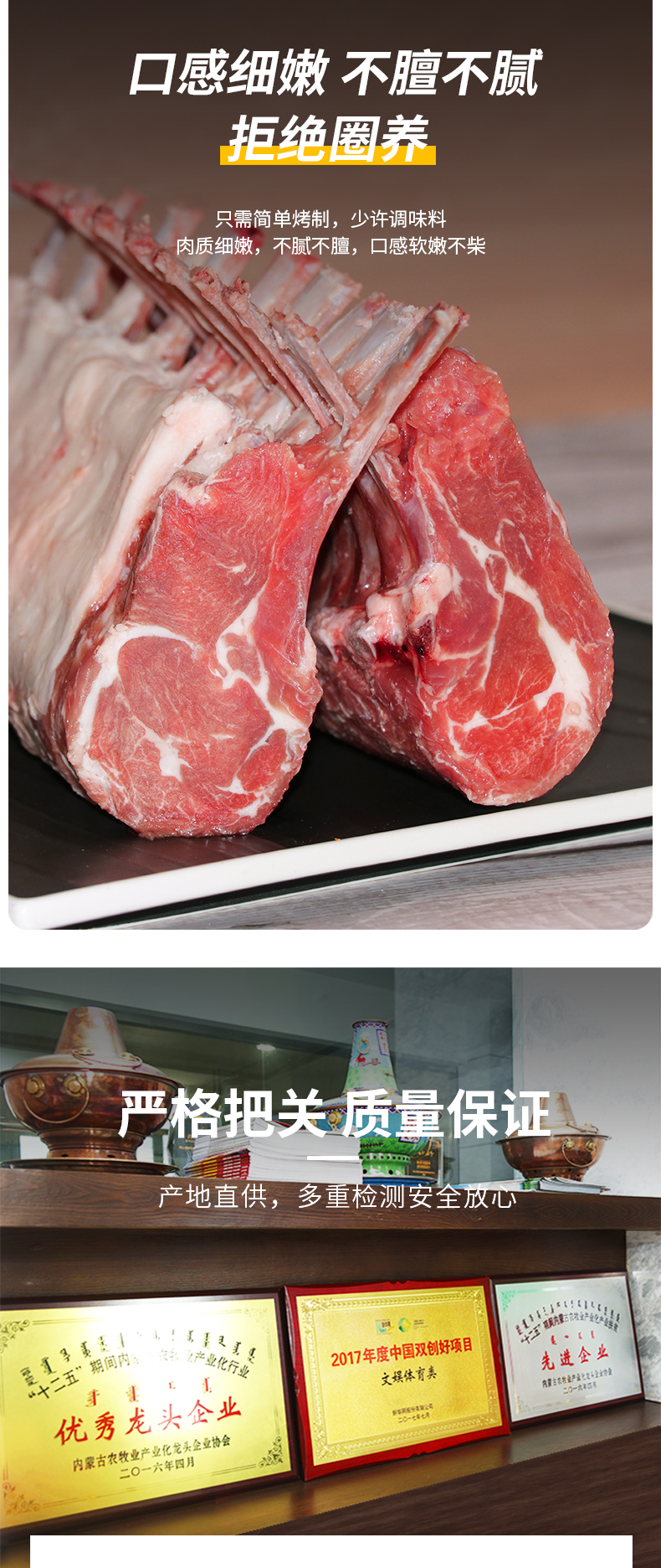 锡林郭勒盟产品质量管理体系认证。正宗锡盟草原散养羔羊,精选具备法式特色的12肋排部位,骨小肉多,肉质细嫩,羊脂均匀,肥瘦结合,羊肉味道香浓,膻味小,非常适合适合制作法式煎羊排、烤羊排。