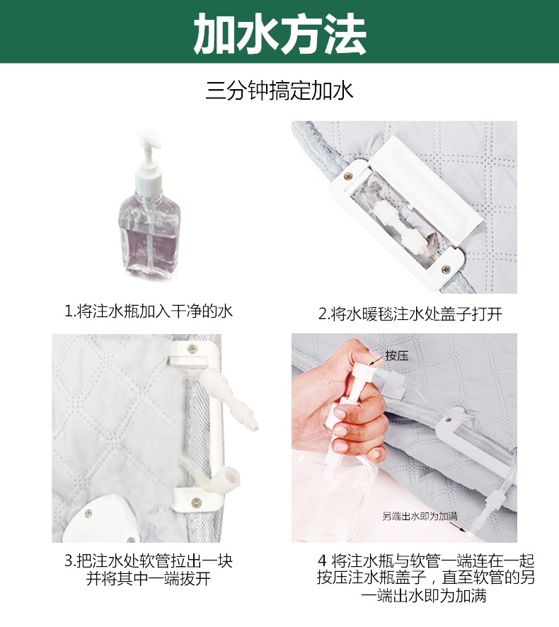 细节上:注水口可拆卸封盖,安全不漏水;接线处灌胶,遇水不漏电,有高温过热自动断电保护成人孩子都能用,由于防水,即使孩子尿床也不怕;1-12小时随意定时,到时自动断电,9档温度随意调控。