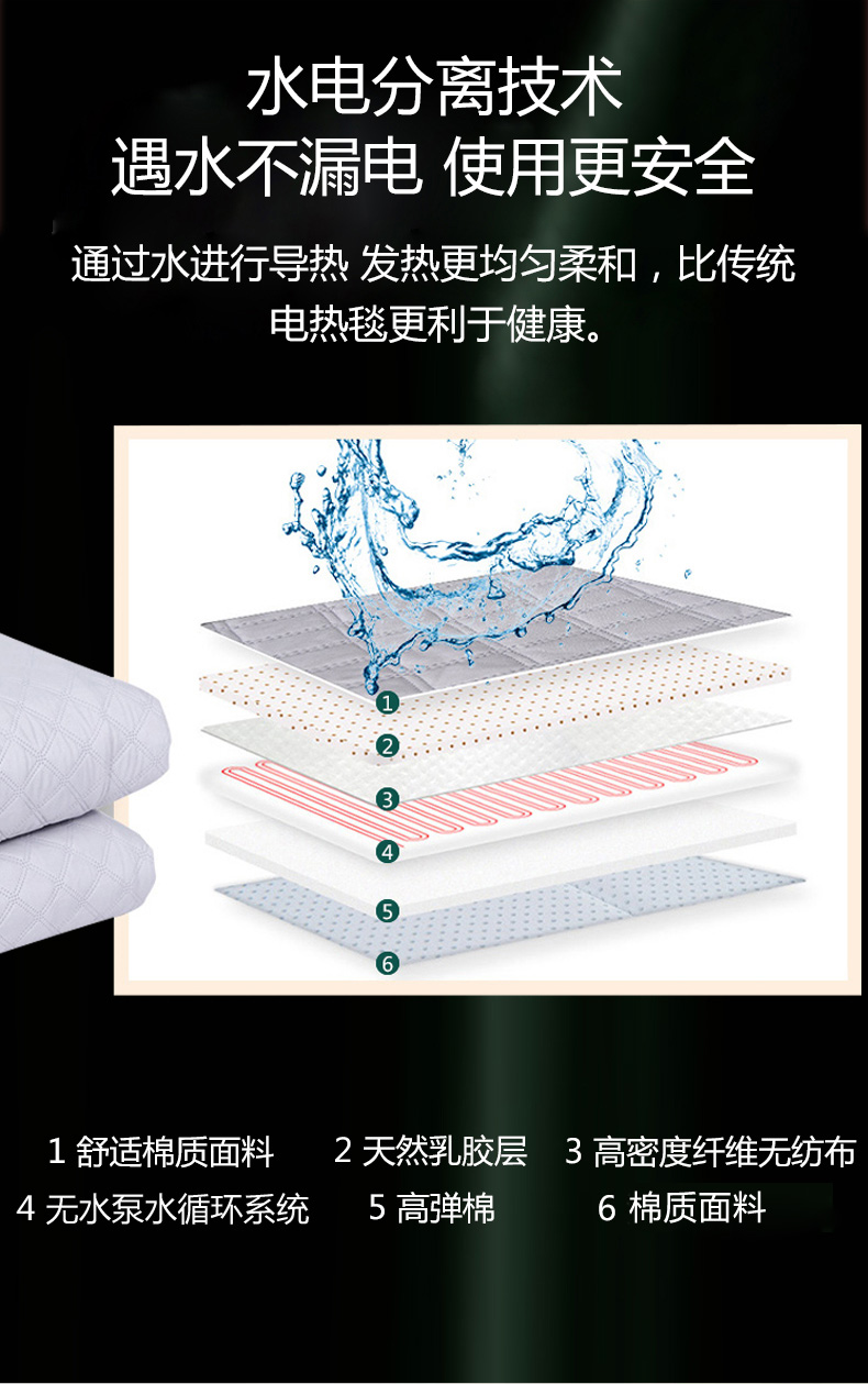毛毯整体六层复合结构:1 表层优质纯棉面料,2 天然乳胶层、3 高密度纤维无纺布、4 无泵水循环系统层、5 高弹家私棉、6 滴胶防滑颗粒