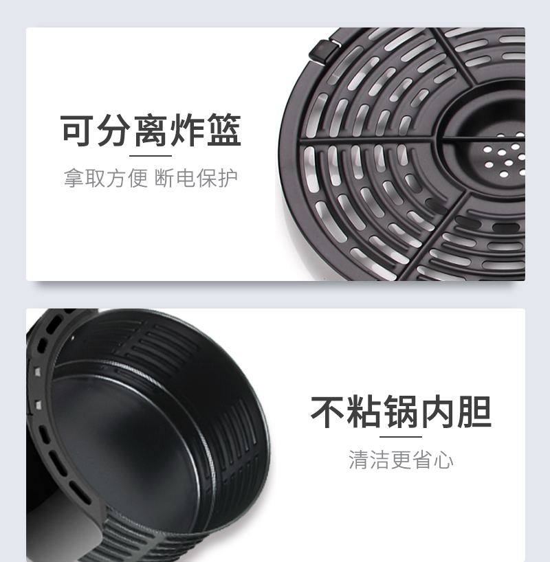 内腔是一体式设计,有不粘油涂层,炸篮和炸锅运用分离技术,按下释放按钮,轻松分离炸蓝和锅底,不粘油更易清洗;锅内容量是3.5L,能满足6-8人可用,一般的空气炸锅只有2L。