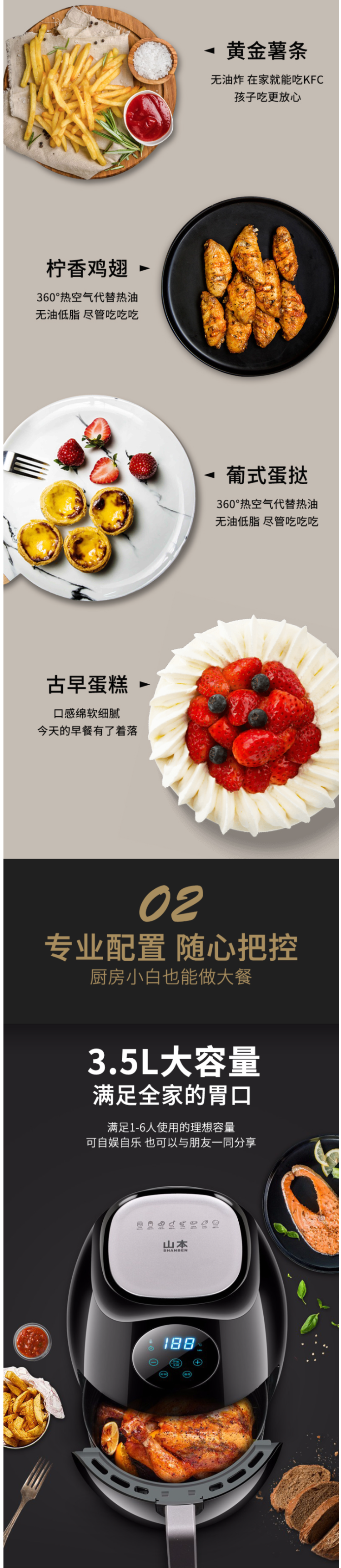这款山本 SB-6878 空气炸锅,3.5L大容量,使用液晶触控,操作更方便,还拥有7大智能便捷菜单。