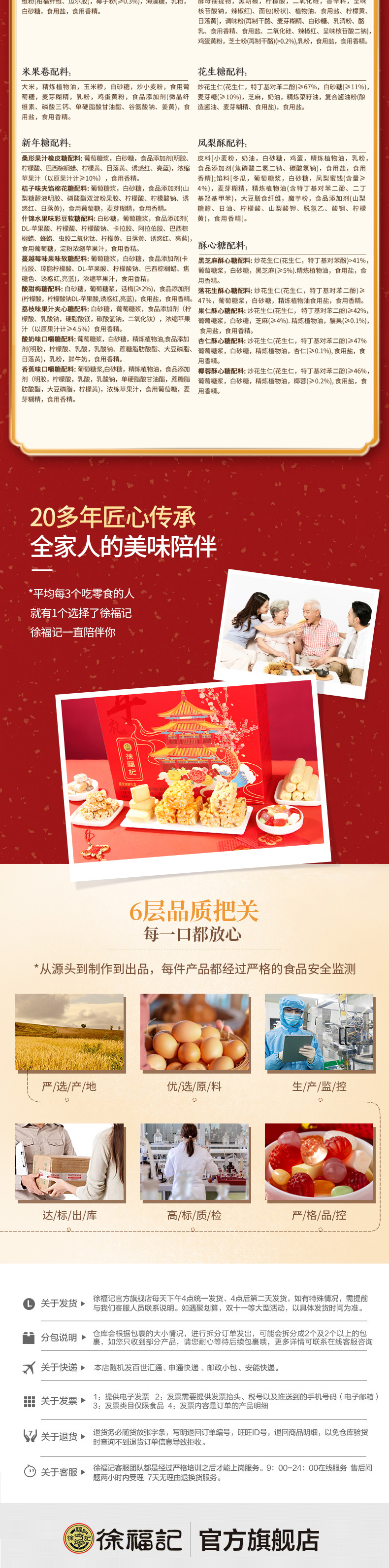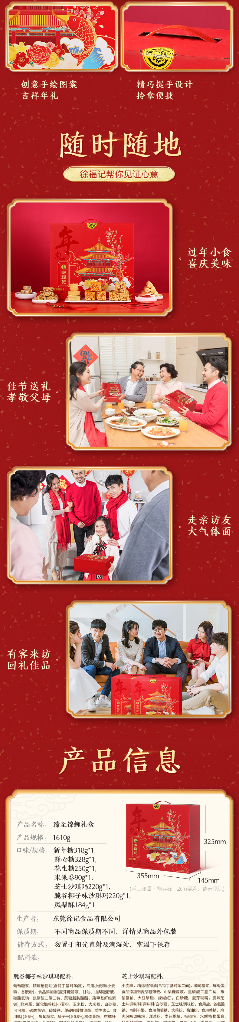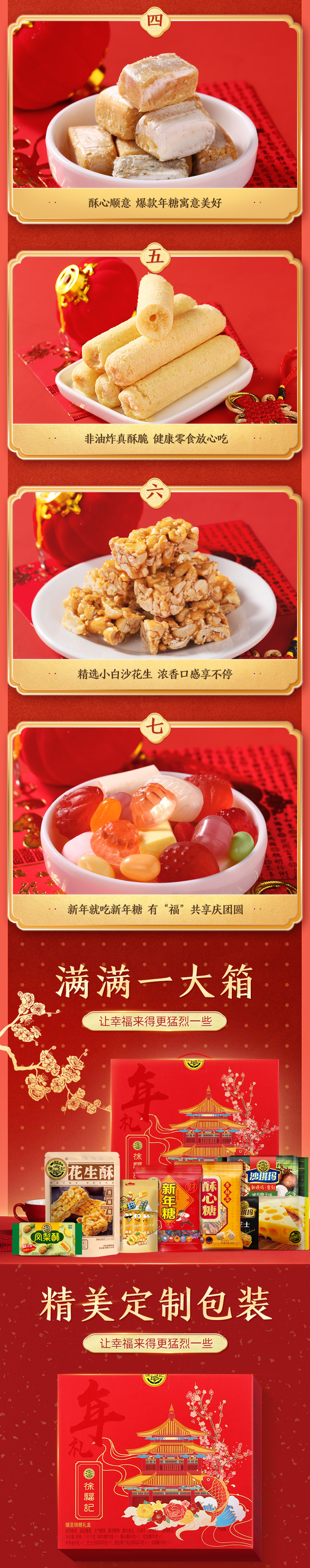 这款徐福记徐福记 臻至锦鲤礼盒,包括:新年糖 318g、酥心糖 328g、花生糖 250g、米果卷 90g、芝士沙琪玛 220g、椰子味沙琪玛 220g、凤梨酥 184g。