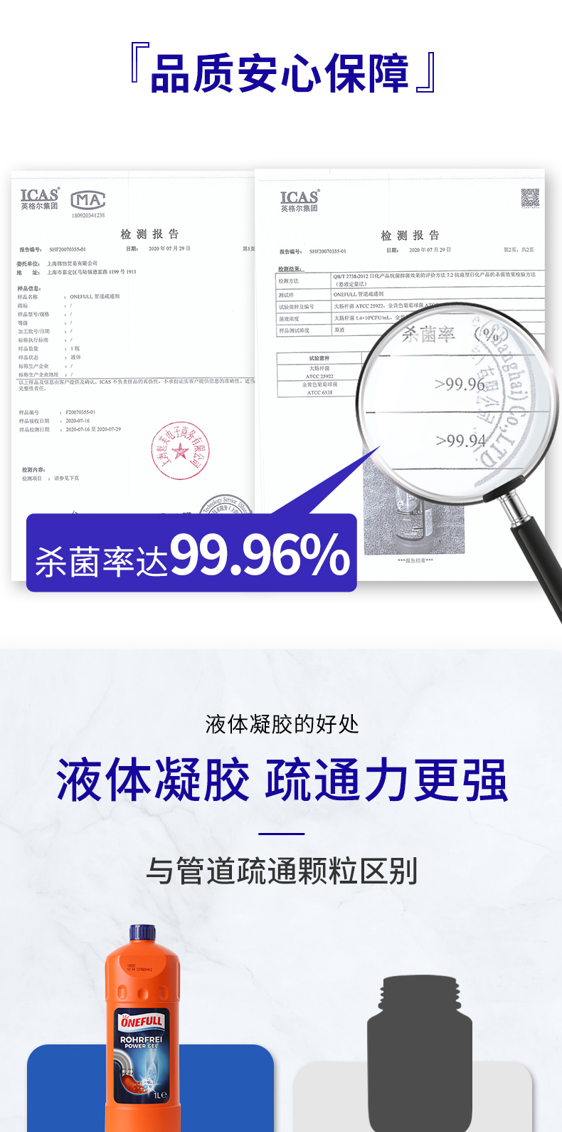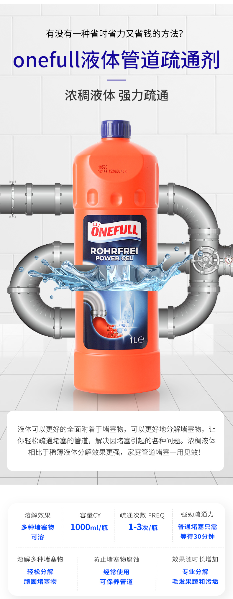 这款Onefall 液体管道疏通剂,规格1L/瓶,液体凝胶状溶剂,持久挂壁,接触面大,可轻松分解常见堵塞物,如毛发、蔬菜、水果、饭渣、纸屑、肉类等,不堵塞情况下也可使用,可轻松分解管道壁上残留的各种垃圾,经常使用可预防堵塞。疏通快,不伤管道,适用于PP、PVC、铸铁、塑料、陶瓷等多种管道材质,杀菌率达99.96%。