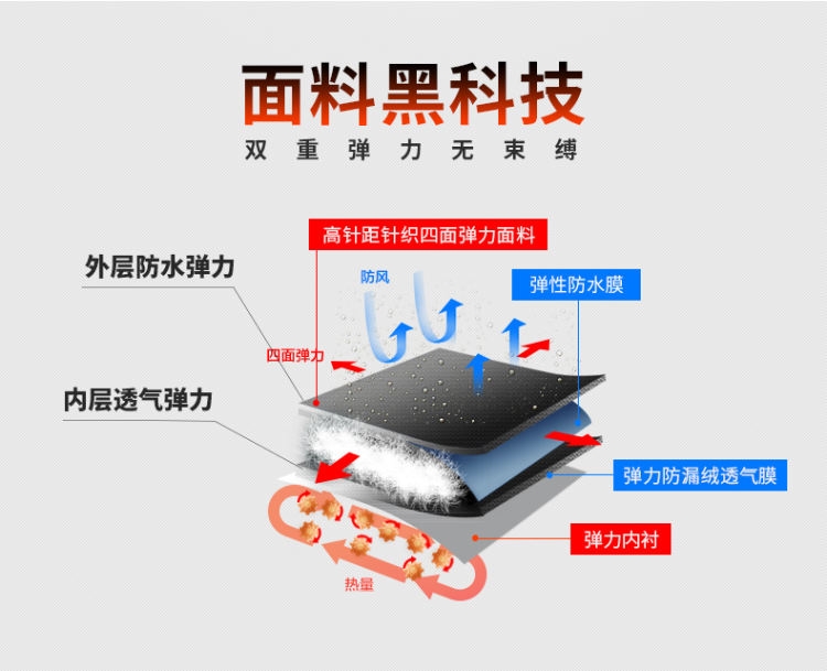 地球科学家的面料是针织的,所以有弹力可拉伸,按理说针织面料都会透风,所以在羽绒仓内,加了两层防风薄膜,所以依然防风。