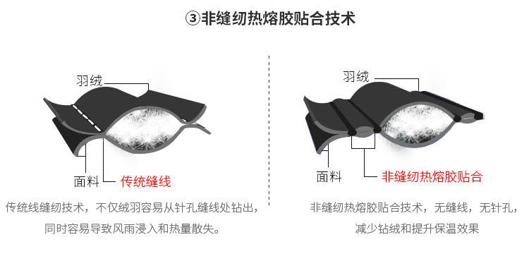 ▲羽绒服的大身,使用无缝纫线工艺,使用热熔胶将面料粘在一起,这种设备很贵。但大身之外的帽子、下摆,和各种拼接处,依然需要缝线固定。