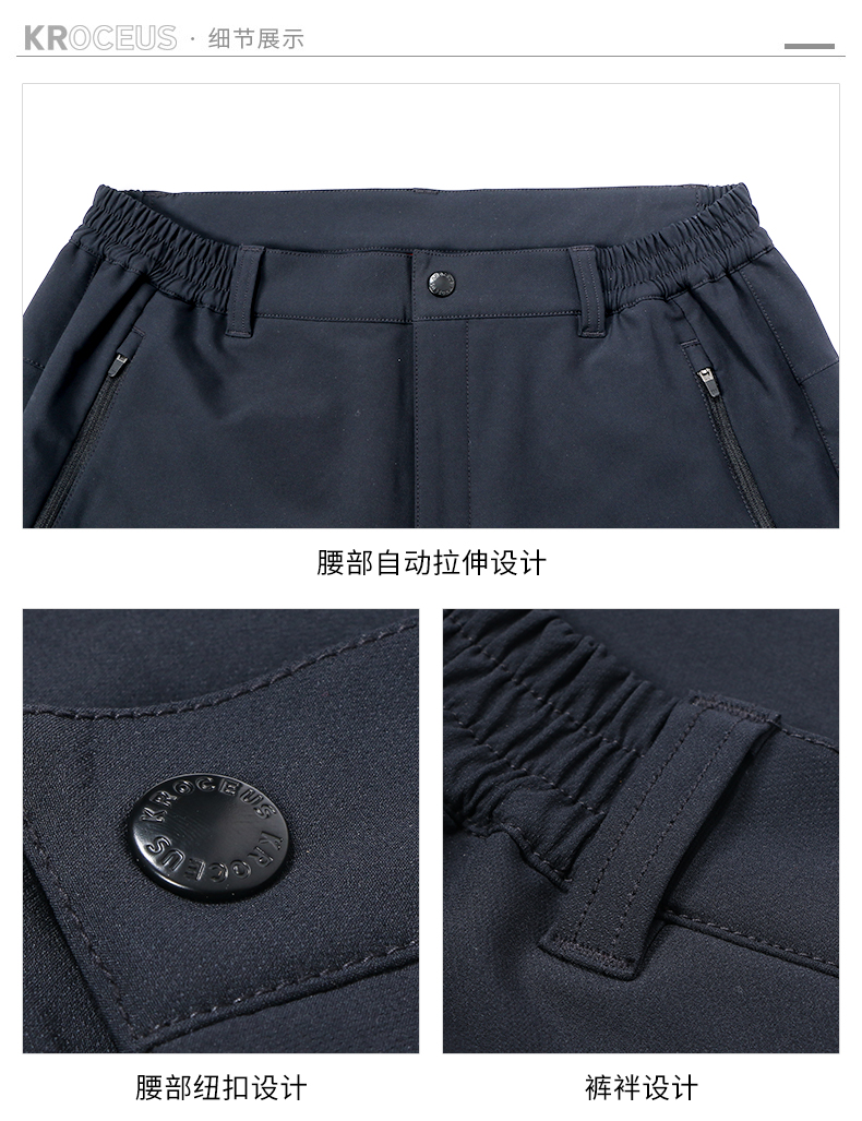 在款式和细节上,单从款式上看不出来是户外徒步裤,除了日常休闲,商务通勤也能穿。膝盖部分是3D立体剪裁,是按人体工程曲线裁剪打版制成,给膝盖在弯曲活动时留下了充足的空间,上身非常合体舒适。腰头两侧有橡筋带裤袢,无论是单穿或用腰带都行。