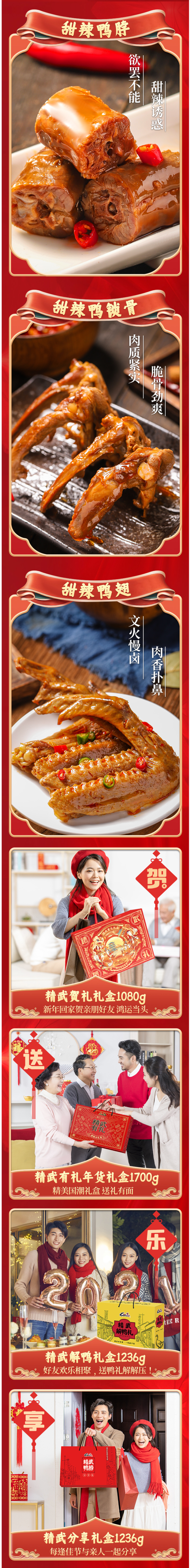 精武贺礼盒装1080g (惊喜限定礼盒):甜辣鸭脖 180g*2袋、甜辣鸭翅 180g*2袋、甜辣鸭锁骨 180g*2袋