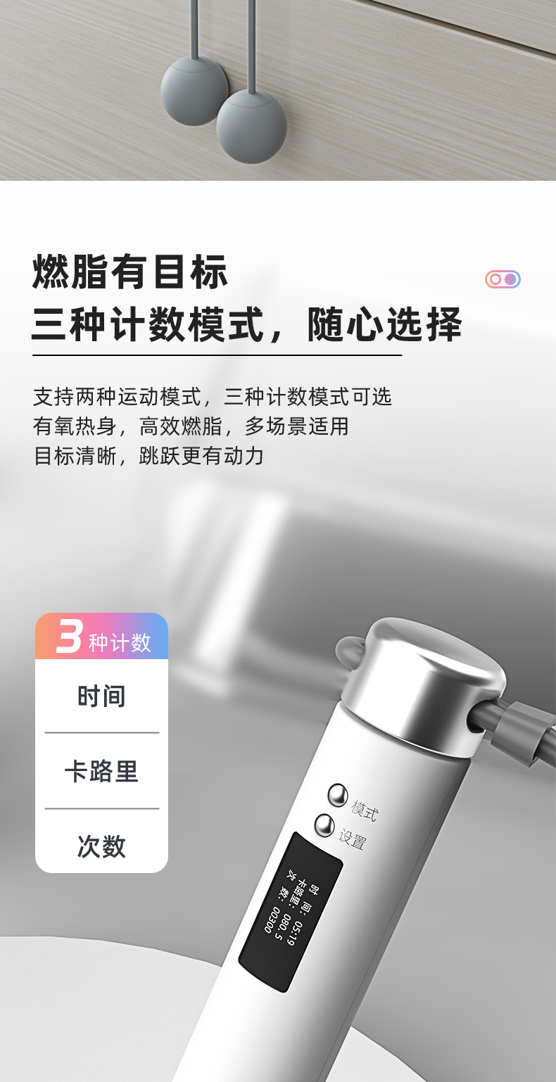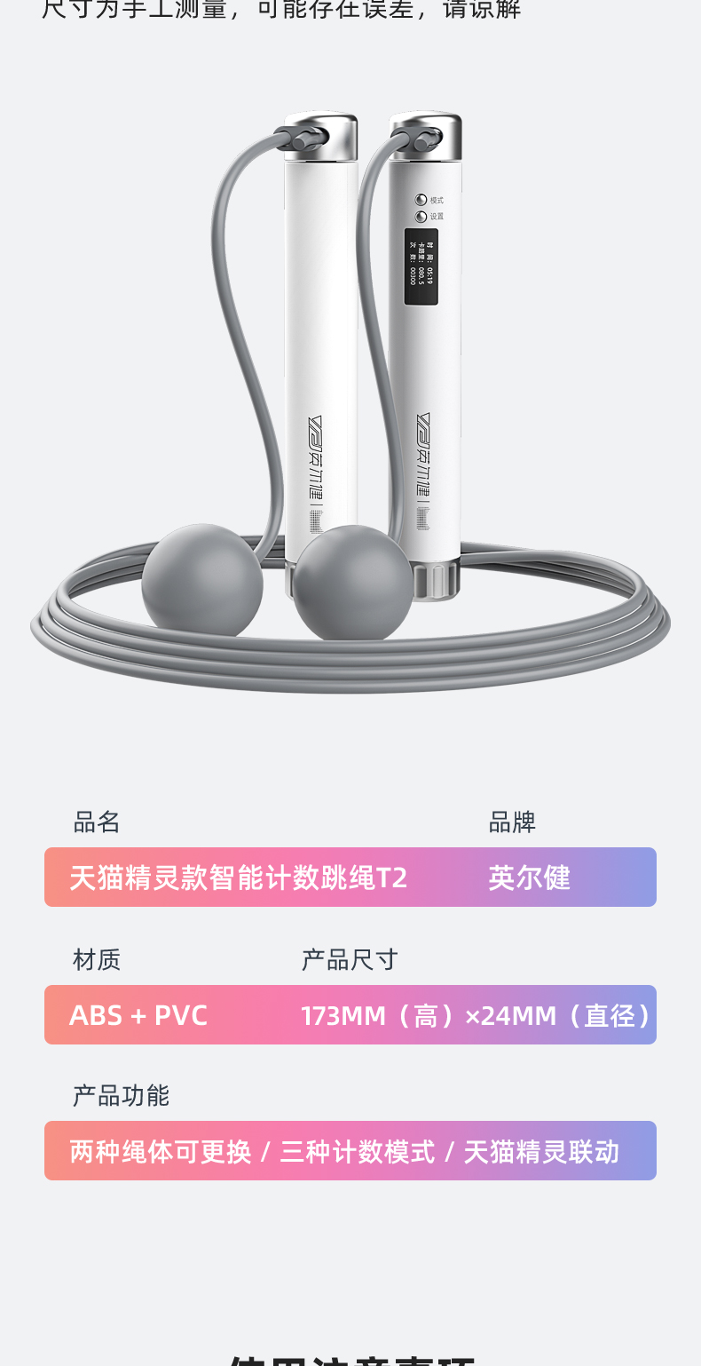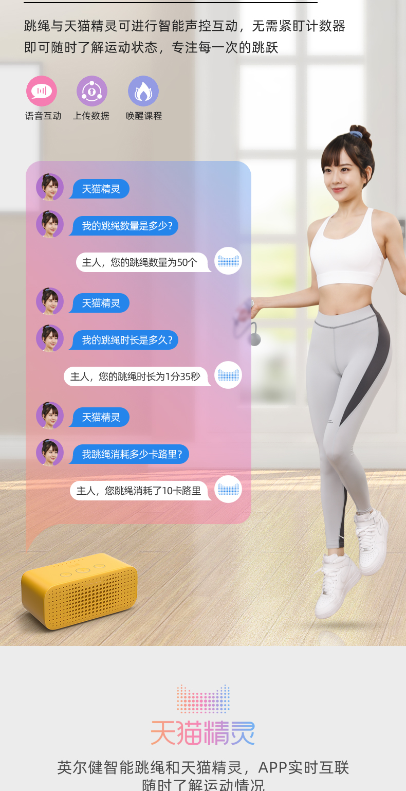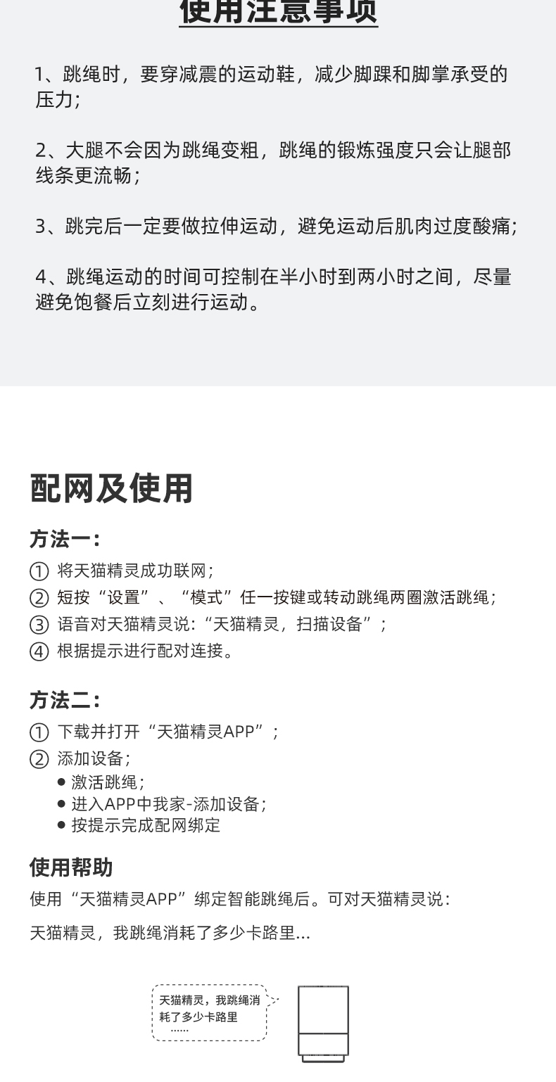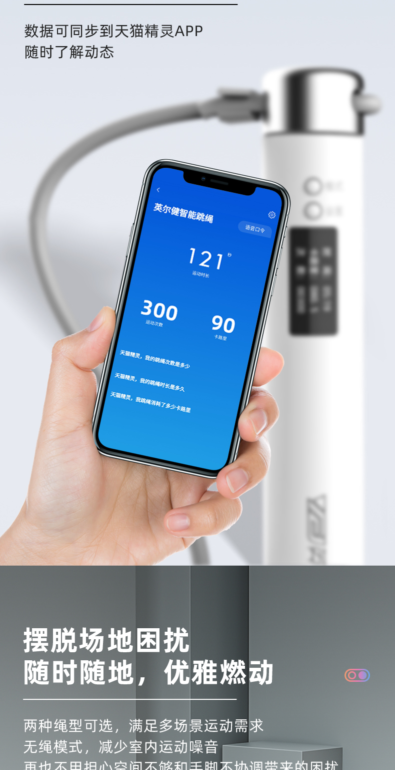这款智能跳绳有无绳有绳两种模式,多种训练模式,智能精准计数,高清显示,离线存储等多种功能,还支持天猫精灵互联,可以随时存储和查看数据,跳绳360度万向轴承,顺滑流畅,7号电池供电,45天超长续航。