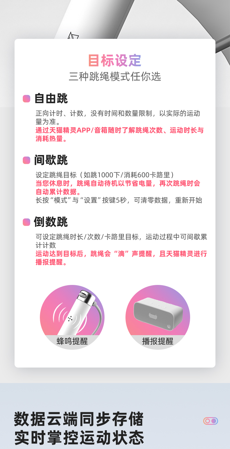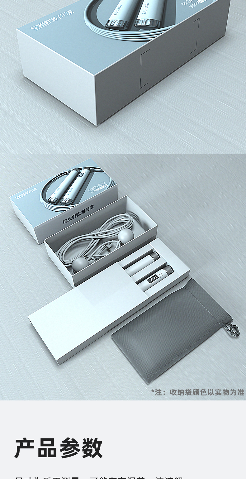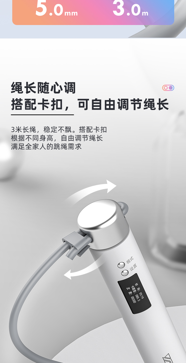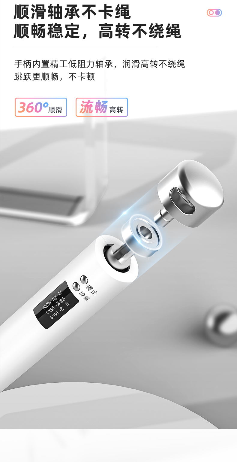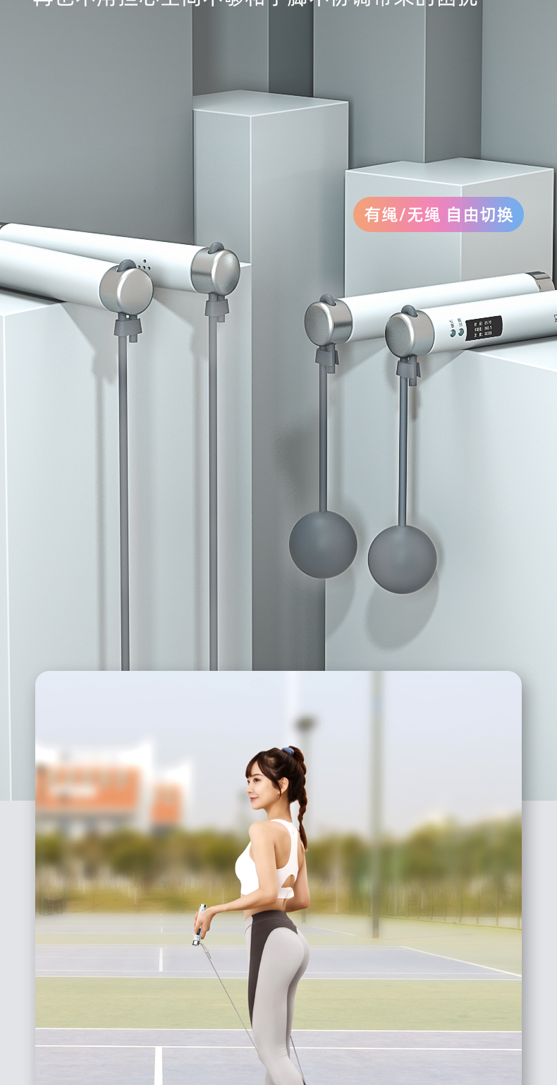 这款智能跳绳有无绳有绳两种模式,多种训练模式,智能精准计数,高清显示,离线存储等多种功能,还支持天猫精灵互联,可以随时存储和查看数据,跳绳360度万向轴承,顺滑流畅,7号电池供电,45天超长续航。
