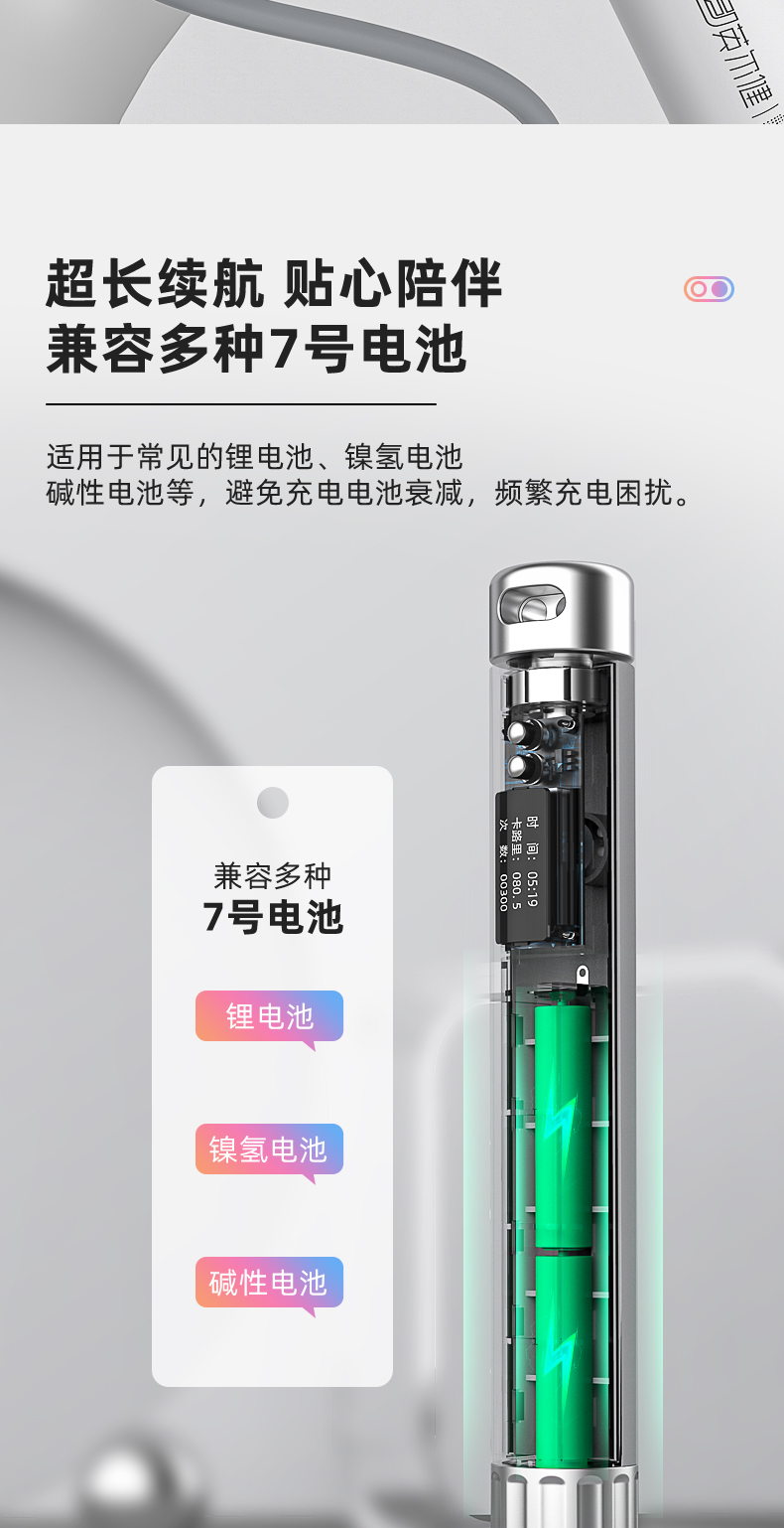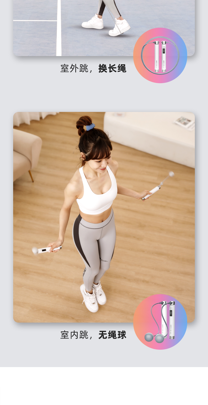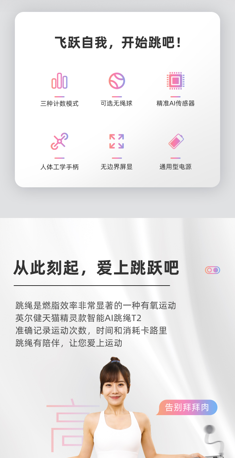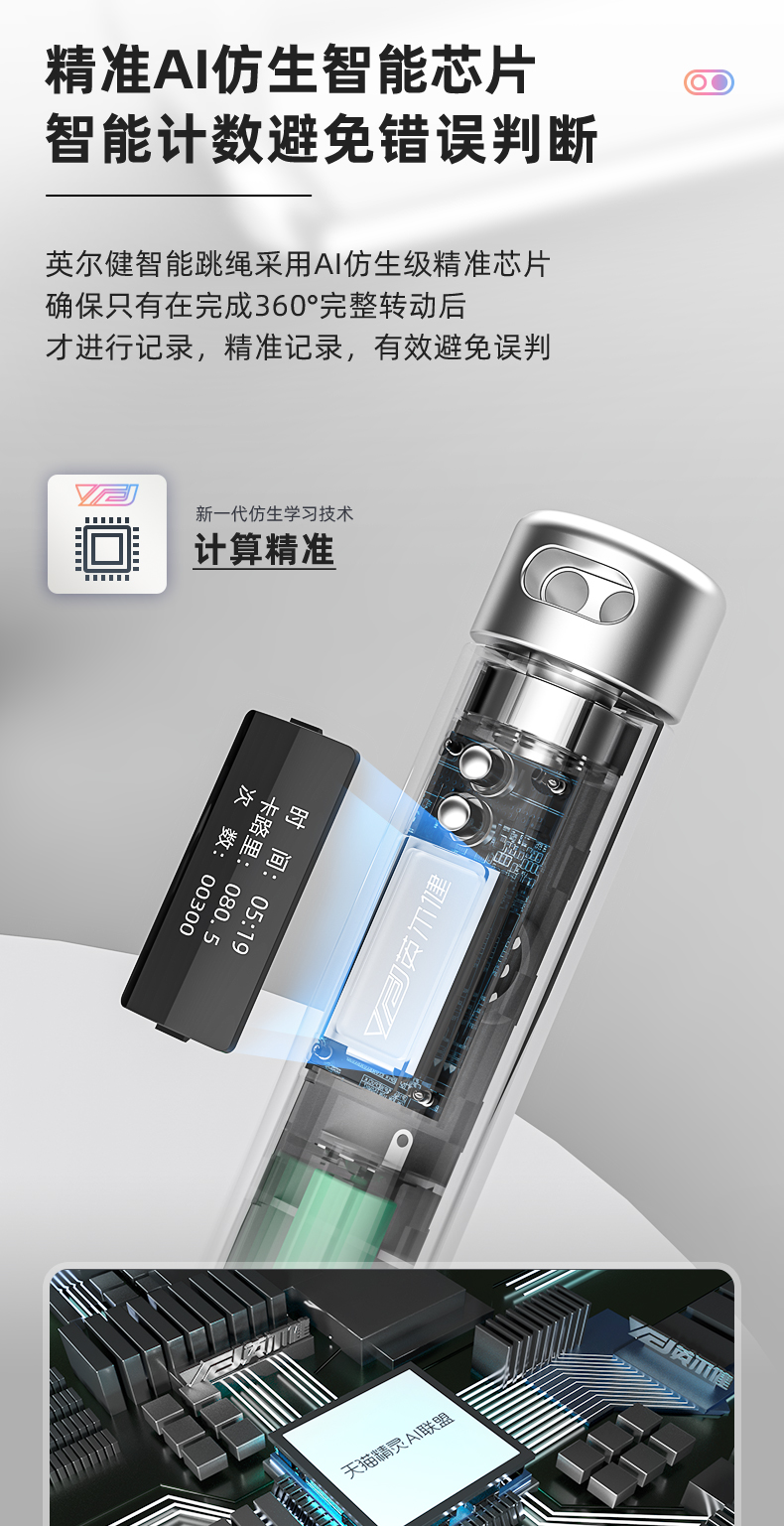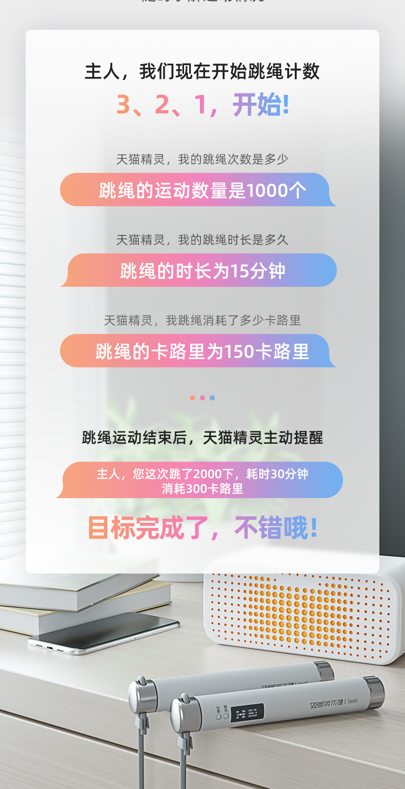 这款智能跳绳有无绳有绳两种模式,多种训练模式,智能精准计数,高清显示,离线存储等多种功能,还支持天猫精灵互联,可以随时存储和查看数据,跳绳360度万向轴承,顺滑流畅,7号电池供电,45天超长续航。