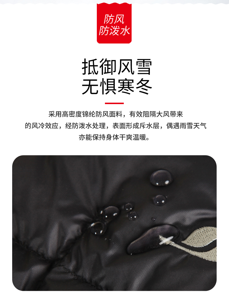 「防钻绒处理」面料与填充的羽绒,使用先车出羽绒隔舱,后充绒的方法,在制作外层面料过程中,羽绒隔舱就预先织出来,后填充羽绒,这样可有效避免羽绒从针眼钻绒。