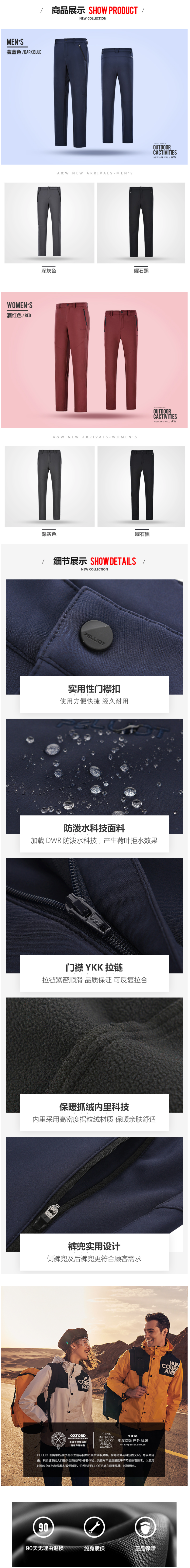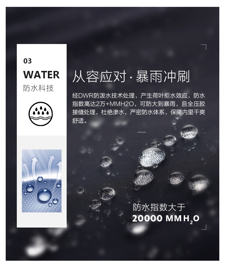 且面料经过DWR防泼水技术处理,在裤子表面形成荷叶拒水效应,并采用全压胶接缝处理,杜绝从车线处渗水,使裤子牢牢成为一个整体,可抵抗暴雨天气。面料透气性出色,避免闷热,提升穿着体验。