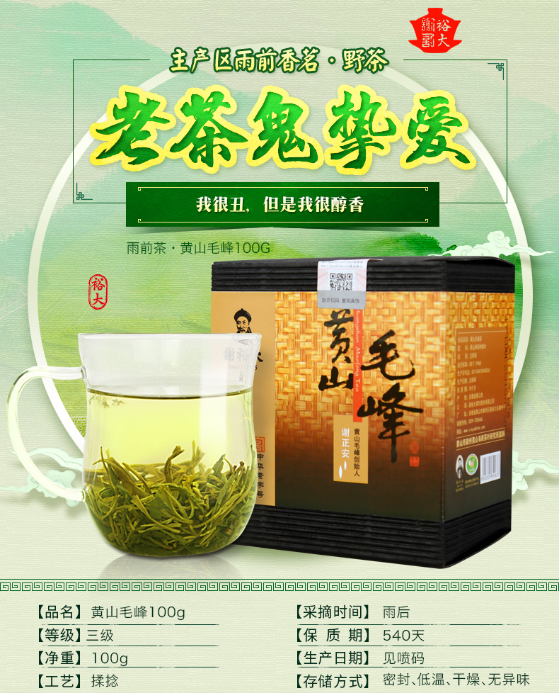 谢裕大茶庄前身为创办于1875年(光绪元年)的“谢裕大茶行”,缔造者谢正安,晚清制茶专家,因其创制的“黄山毛峰”,而被载入史册,“谢裕大茶行”因此名声鹊起,成为上海滩首屈一指的大商号,为中华老字号茶行之翘首!2010年,谢裕大茶行成功改制为黄山谢裕大茶叶股份有限公司,公司产品中黄山毛峰和太平猴魁为“国家地理标志保护产品”。公司实际控制人、董事长谢一平先生既是省级非物质文化遗产项目“绿茶制作技术”代表性传承人,也是黄山毛峰创制者谢正安的第五代嫡系制茶技艺传承人。2010年,获国家商务部“中华老字号”认定。