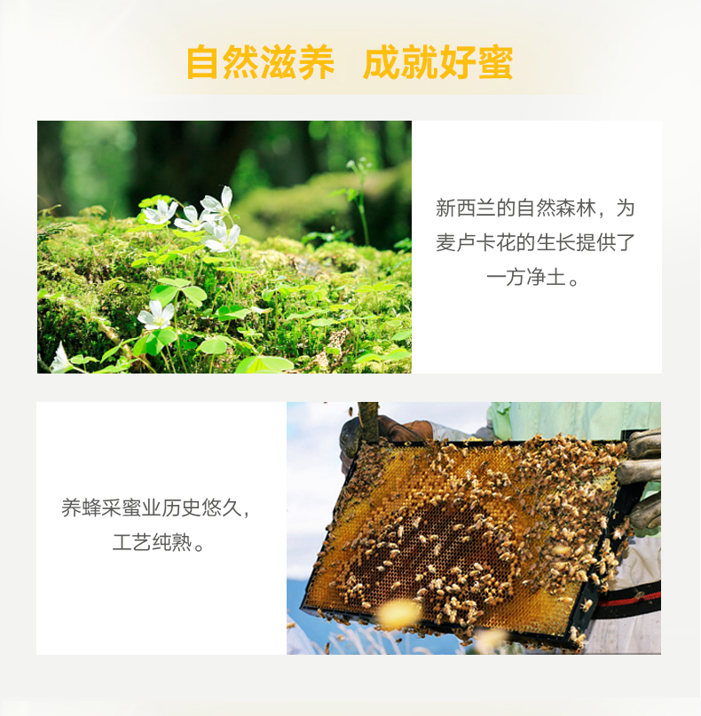 在新西兰和澳洲均已得到广泛的临床证实,在美国更是蜂蜜中唯一准入药品市场的添加成分麦卢卡蜂蜜中,含有一种抗菌因子-麦卢卡因子,有良好的抗氧化能力,可以促进伤口自然愈合,尤其在对调养诸如慢性胃炎、幽门螺杆菌、胃溃疡等胃肠道疾病上效果非常好。